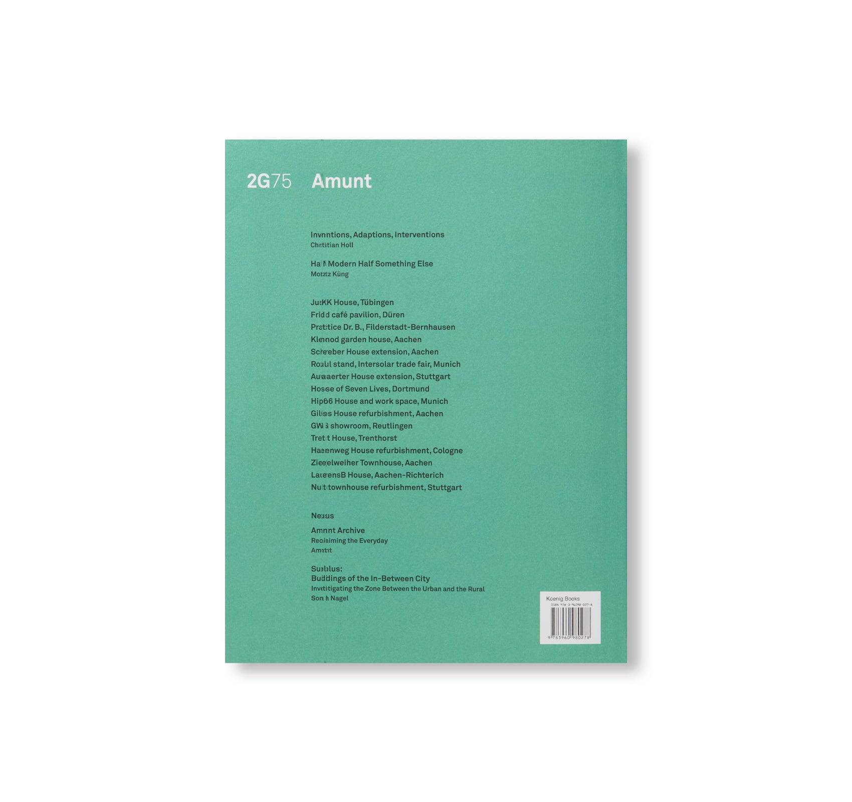 スペイン発の建築雑誌「2G Magazine」第75号。本号では建築家、ビョーン・マルテンソン(Björn Martenson)、ソーニャ・ナーゲル(Sonja Nagel)、ヤン・タイセン(Jan Theissen)の建築家3人によって2010年に活動をスタートしたドイツの設計事務所「AMUNT」を特集。その作品は、厳格さや直線的な特徴を持つとは言い難く、主に小さな家、改築や増築、内部の改装、空間への干渉に関する作品が多く見られる。広義での文脈とされうるもの全てを一貫して徹底的に検証することで生み出されるその作品は非常に興味深いものとして仕上がっている。