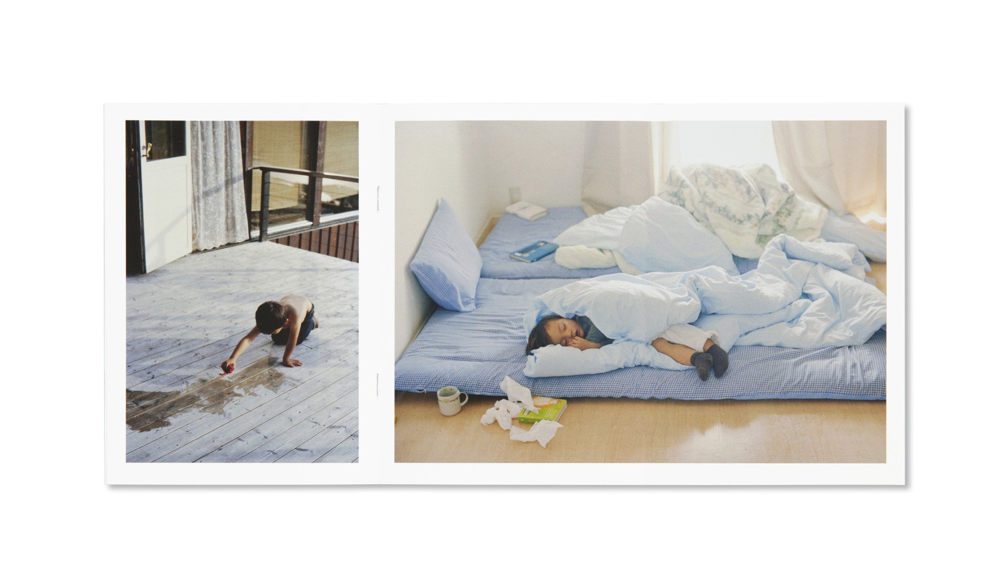 It’s impossible to look at this body of work featuring members of Ola Rindal’s (b. 1971, Norwegian) family and not want to immediately transport yourself into their world, or feel as if you might have been magically transported there already, simply by looking in. A world where leaving is as beautiful and hopeful as arriving, a light on the path appears just before your next step, and you are always, always within 10 minutes of a warm nap. His work here is a study in contradictions: intensely intimate yet protective of his subjects, warm and fuzzy even when you’re viewing a literal icicle. It urges you to be more inquisitive while keeping you at arm's length. Maybe in this work he is revealing to us that most sought-after thing called balance. Balance can be messy, though. Balance is vague. Balance, for many people, is doing whatever it takes to tip the scale back in the other direction after too much indulgence or lack of discretion. Balance is a green juice after too much tequila. Balance is a silent retreat after too much noise. It's a €400 skincare treatment that might finally undo all the sun you soaked up as a teen. But what if balance is a state of peaceful equilibrium so achievable, so within reach, that we could get there by simply shifting the way we view the world around us? What if balance has been there all along? We should all be willing to find out, and the images herein might be a clue as to where we should look. The book is divided into three publications - one for each family member of the author: son, wife and daughter, in alphabetical order. Each publication has an identical page count and number of images. The photographs were taken in Norway, Japan and France, where the artist's family originated from.