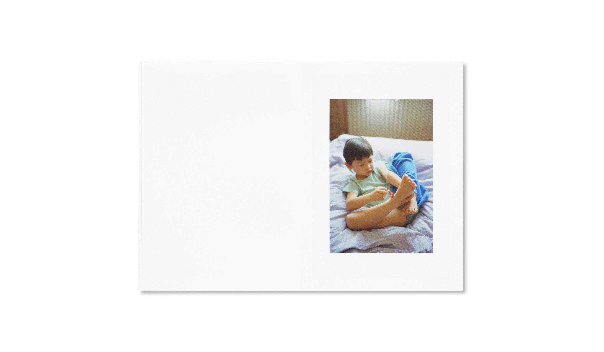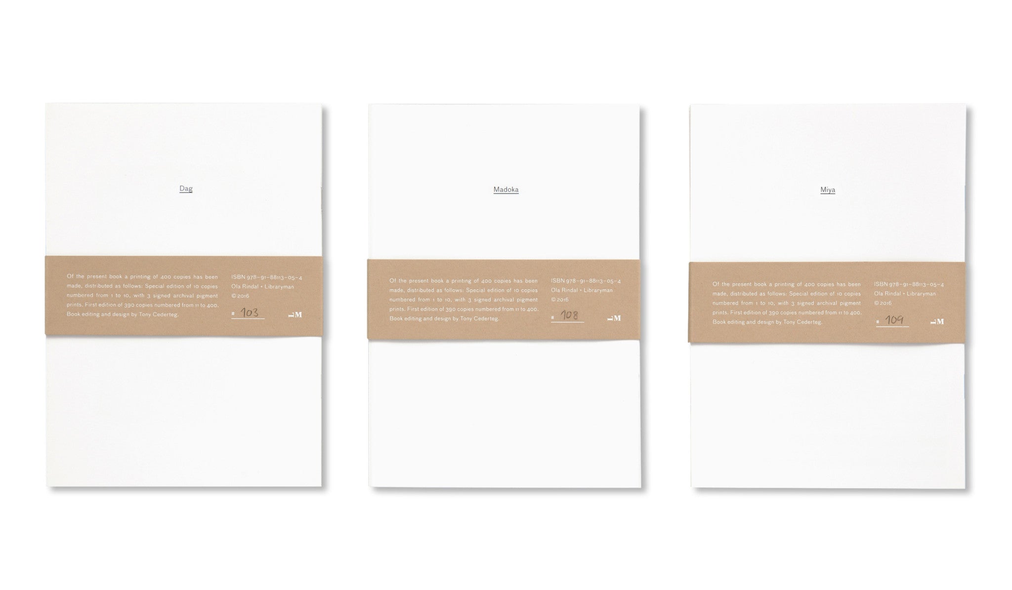 ノルウェー人フォトグラファー、オラ・リンダル(Ola Rindal)の作品集。本作は3冊からなり、全て同じサイズ、ページ数、イメージ数で構成されるが、それぞれが作家の3人の家族(息子 Dag / 妻 Madoka / 娘 Miya)のポートレイト集となっている。3人がそれぞれ生まれ育った土地(ノルウェー / 日本 / フランス)で撮影された作品は、視る者を写真に切り取られた空間へと誘う。それどころか、すでに写真のなかの彼らと同じ空気を吸い、同じ時間を過ごしているかのような感覚さえもおぼえさせる。作者の作品には、家族という存在にしか明かされないような親密で居心地の良い一面にも、つねに彼らを見守る作家のあたたかい眼差しが存在する。被写体である家族への慈しみに溢れる写真は、まるでまどろむようなやさしい空気を纏う。
