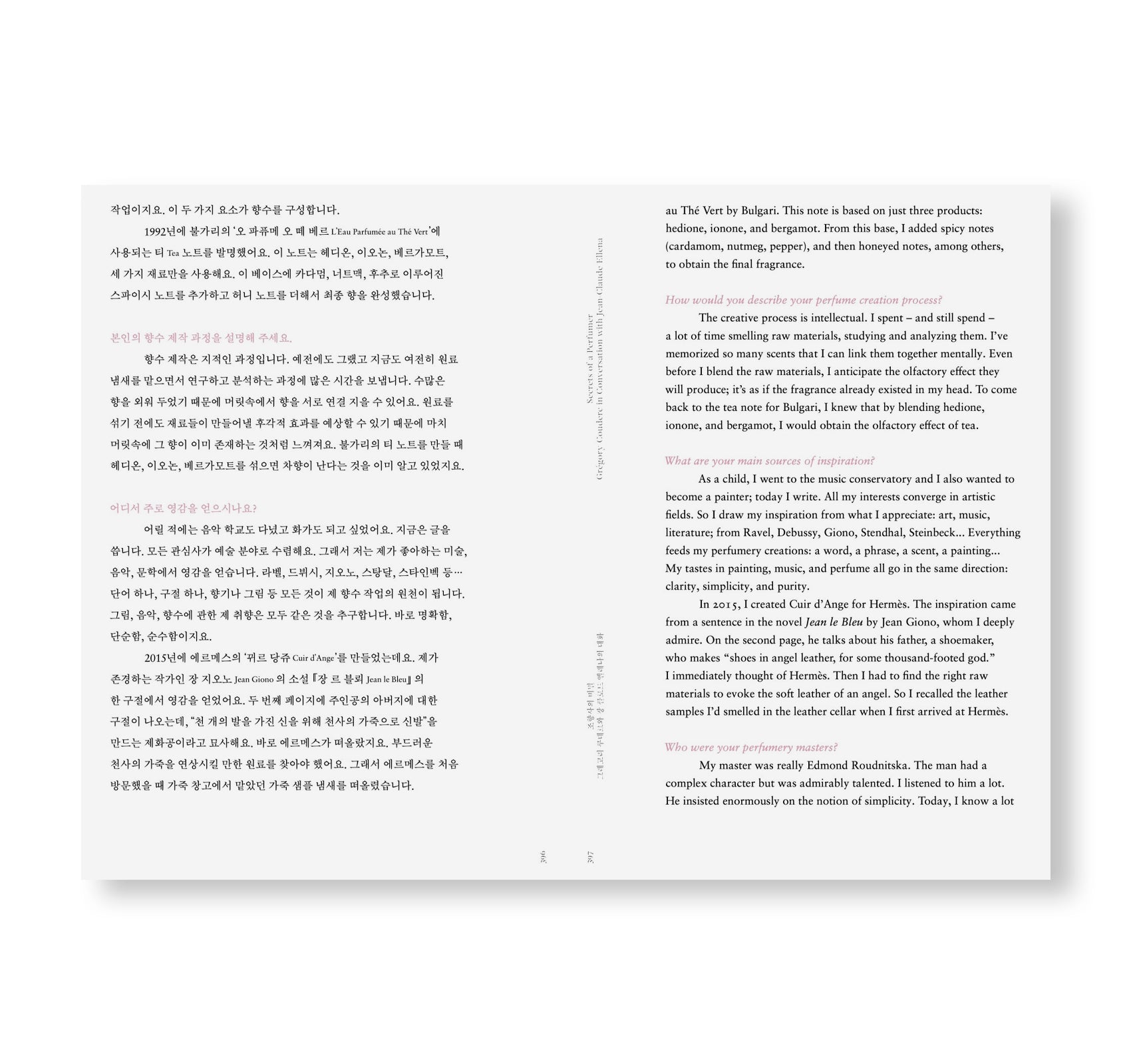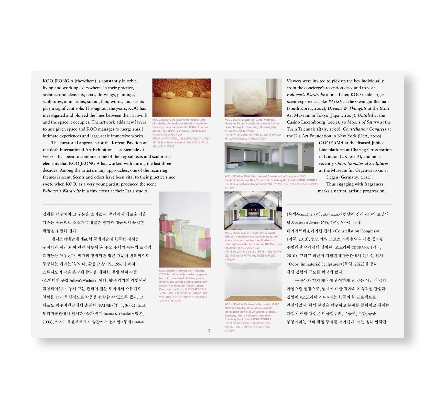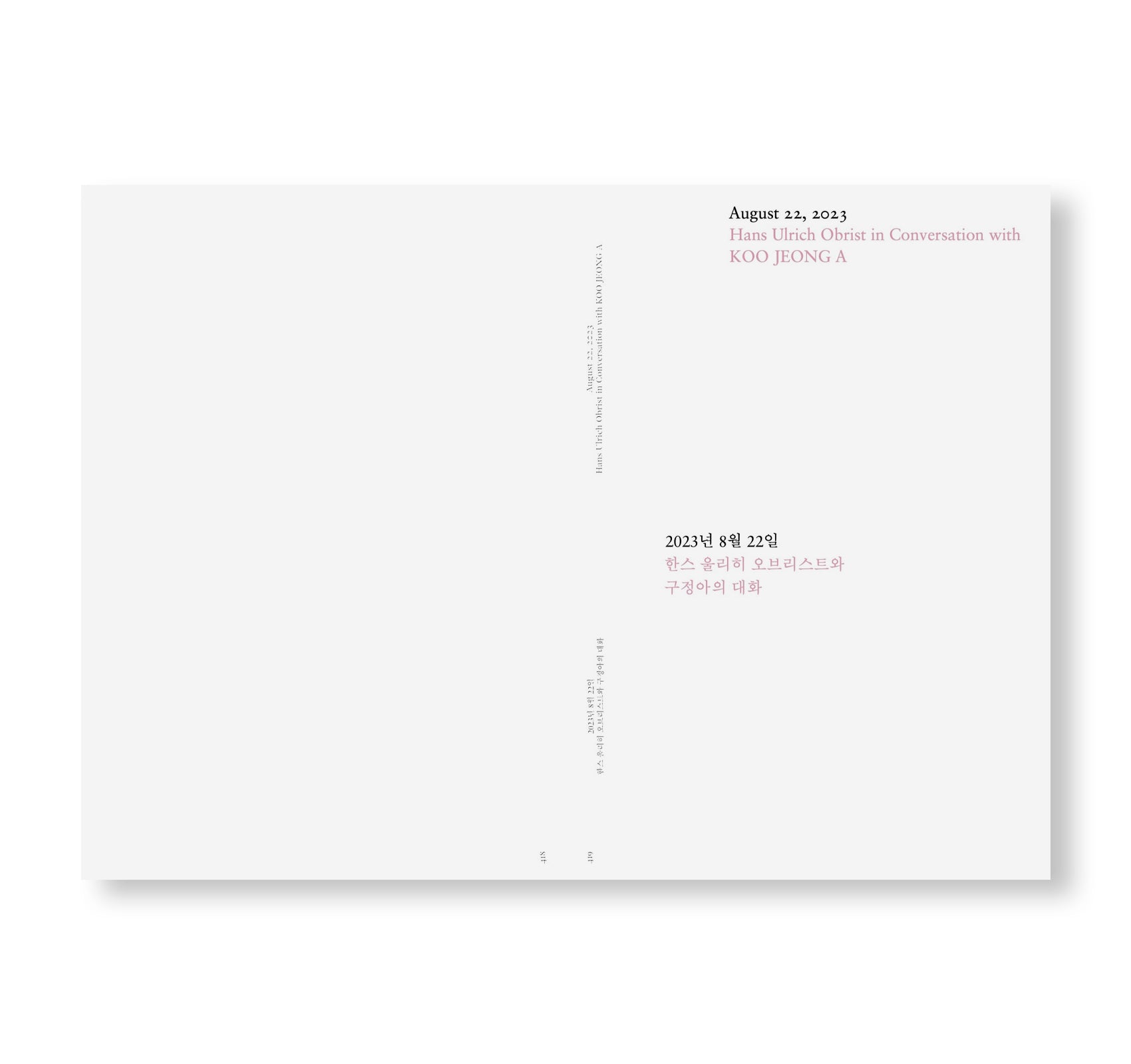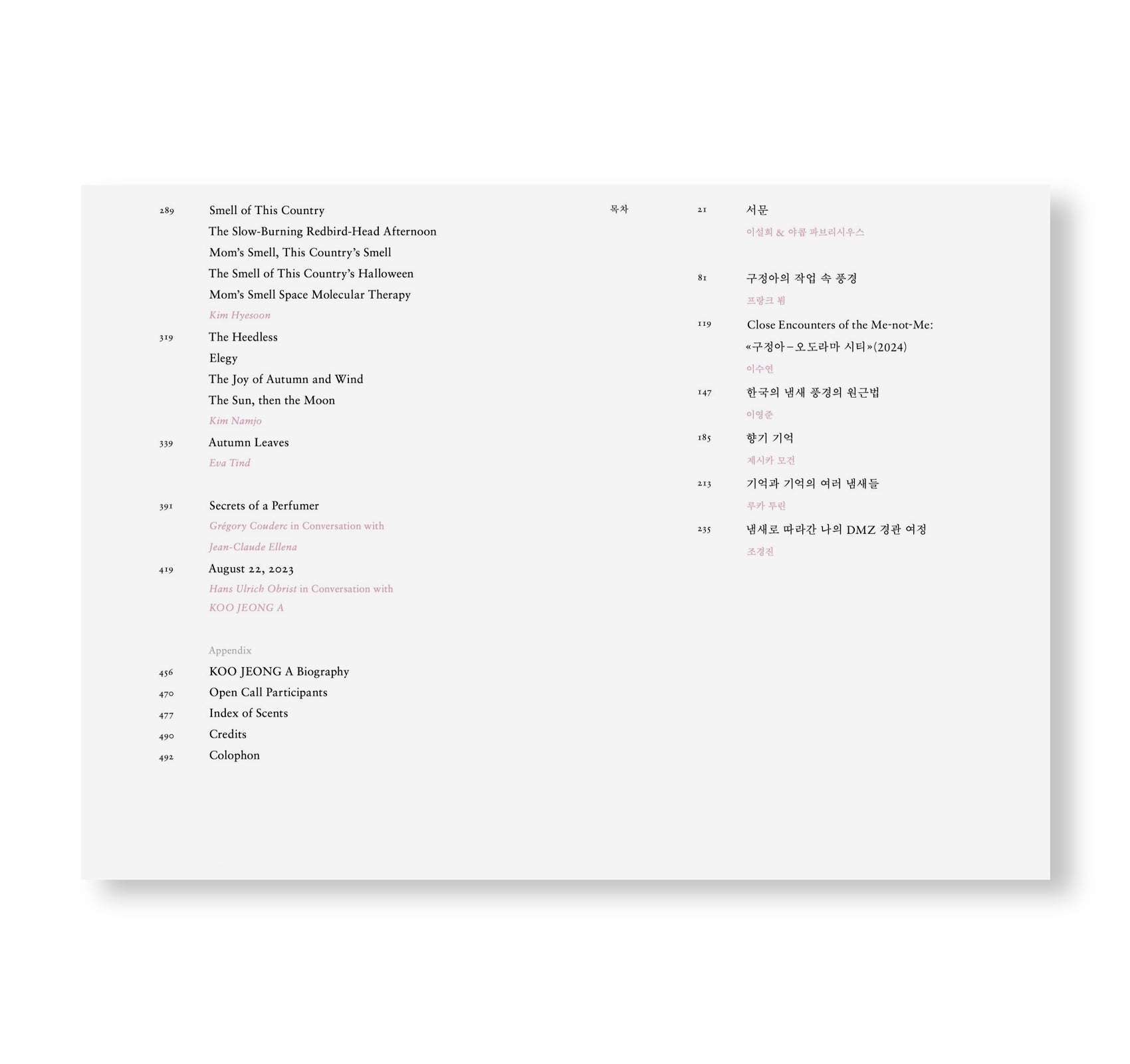 The publication accompanying the exhibition includes texts by Frank Boehm, Sooyon Lee, Lee Young June, Jessica Morgan, Luca Turin, Kyung Jin Zoh, poems by Kim Hyesoon, Kim Namjo, Eva Tind, an interview by Grégory Couderc (with Jean-Claude Ellena), an interview by Hans Ulrich Obrist (with KOO JEONG A), and an introduction by the Artistic Directors Seolhui Lee and Jacob Fabricius.