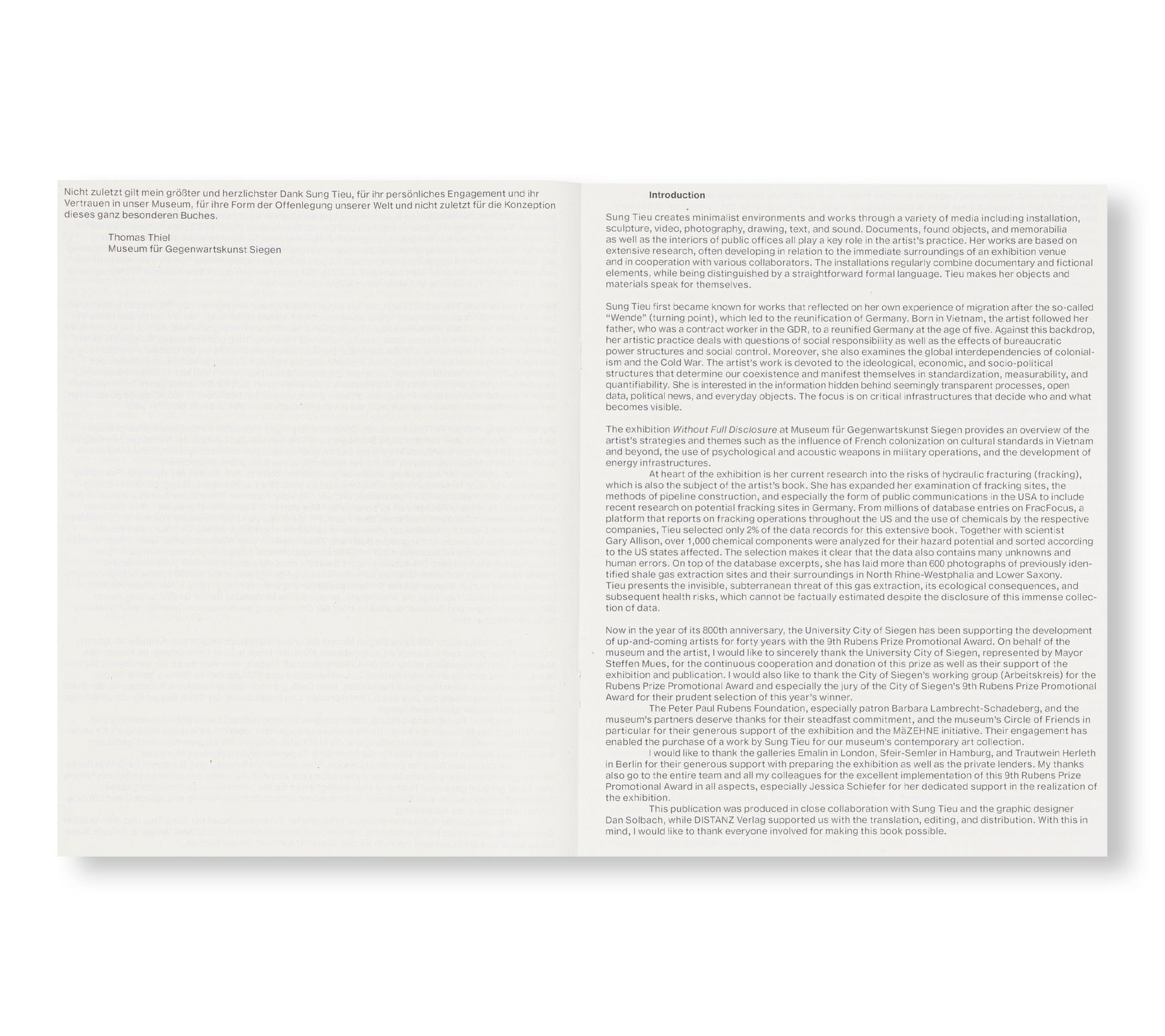 On the occasion of her receipt of the Rubenspreis’s 9th emerging artist’s award, Sung Tieu has developed the experimental book project Without Full Disclosure, which delves into the subject of fracking (hydraulic fracturing), a controversial technique serving to extract natural gas and petroleum. Working with the data analyst Gary Allison, Tieu has processed millions of entries in the database FracFocus, an American platform documenting fracking operations, to analyze the sheer quantity and chemical components involved with a view to the dangers they pose. Complementing her engagement with the questionable methods and sites of the fracking industry and its opaque public relations practices in the U.S., she also undertook research on potential sites in Germany, compiling over six hundred photographs. Her artist’s book combines these pictures with the data on more than one thousand pages to point up the incalculable ecological as well as health hazards.