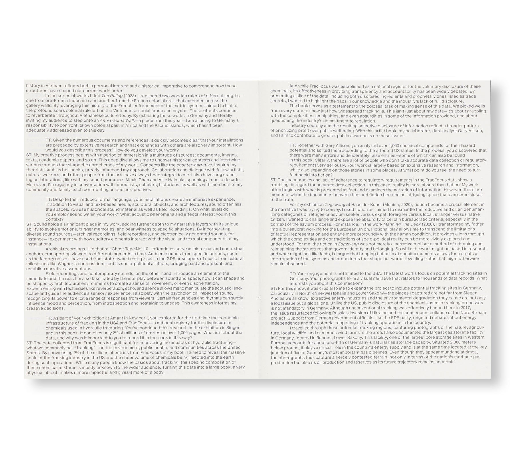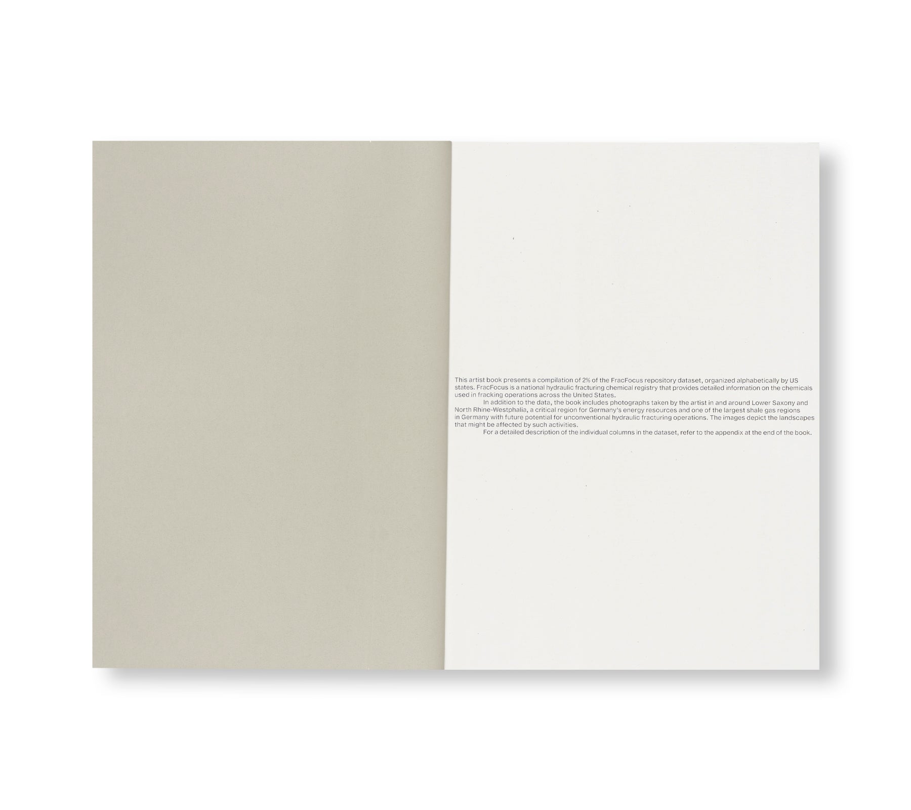 作者は、天然ガスや石油の採掘技術として物議を醸しているフラッキング(水圧破砕)をテーマにした実験的なプロジェクトを展開する。データアナリストであるゲイリー・アリソン(Gary Allison)と協働し、フラッキング作業を記録するアメリカのプラットフォームであるデータベース「FracFocus」の何百万もの入力を処理、それらがもたらす危険性を視野に入れながら分析した。米国におけるフラッキング産業の疑わしき方法とその現場、そしてその不透明な広報活動を補完すべく、ドイツの潜在的な現場についても調査を行い、600枚以上の写真をまとめた。本書は、その写真と1,000ページ以上に及ぶデータを組み合わせ、計り知れない生態系と健康への危険を指摘する。