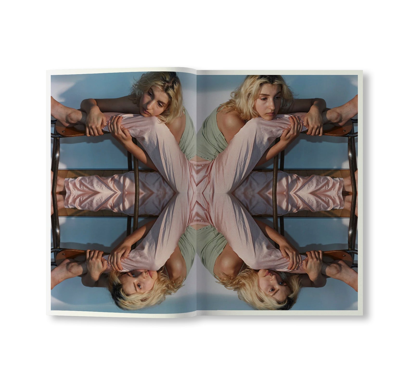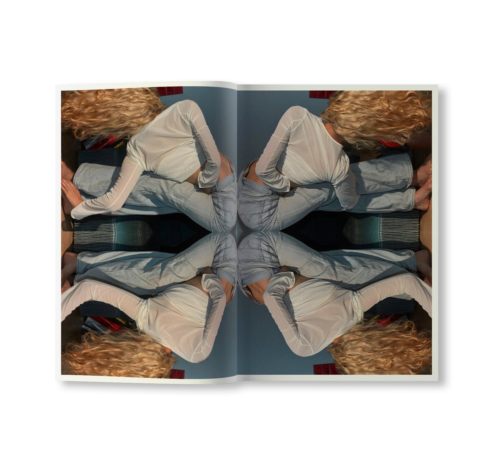 The result oscillates between hypnotic patterns, Rorschach tests, and a visual game where the center and periphery of the image seem intimately connected. As in the artist’s previous book with Art Paper Editions (Inner, 2022), a female figure takes center stage. Here, the intimate space serves as a backdrop for a choreography organized into a rhythmic pattern.
