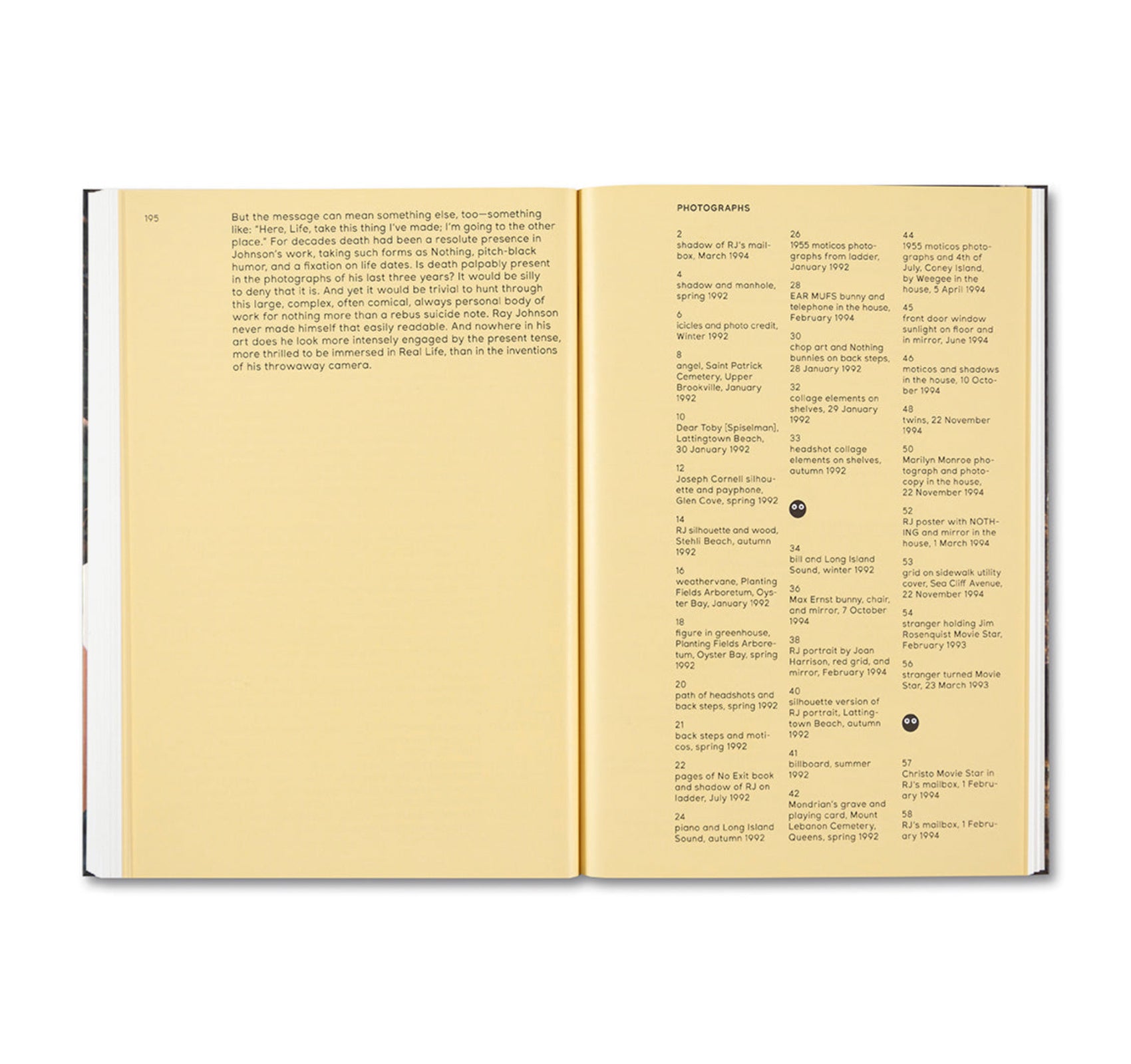 A widely connected pioneer of Pop and mail art, Ray Johnson was described as ‘New York’s most famous unknown artist.’ Best known for his dense, allusive collages, he stopped exhibiting in 1991, but his output did not diminish. Between 1992 and 1994, using 137 disposable cameras, he created a large body of work that is only now coming to light. Staging his artworks in settings near his home in Locust Valley, Long Island — parking lots, sidewalks, beaches, cemeteries — Johnson made photographs that make the world of everyday ‘real life’ a part of his art. Within a few months, he devised a large new freestanding format for the simplified collages he began calling the ‘movie stars’ of his camera tableaux. When he swam to his death at sea on 13 January 1995, Johnson left behind a vast archive that included over three thousand of the late photographs. What he called his ‘new career as a photographer,’ which makes its debut in print here, marked the close of a romance with the camera that had spanned four decades of relentless invention.