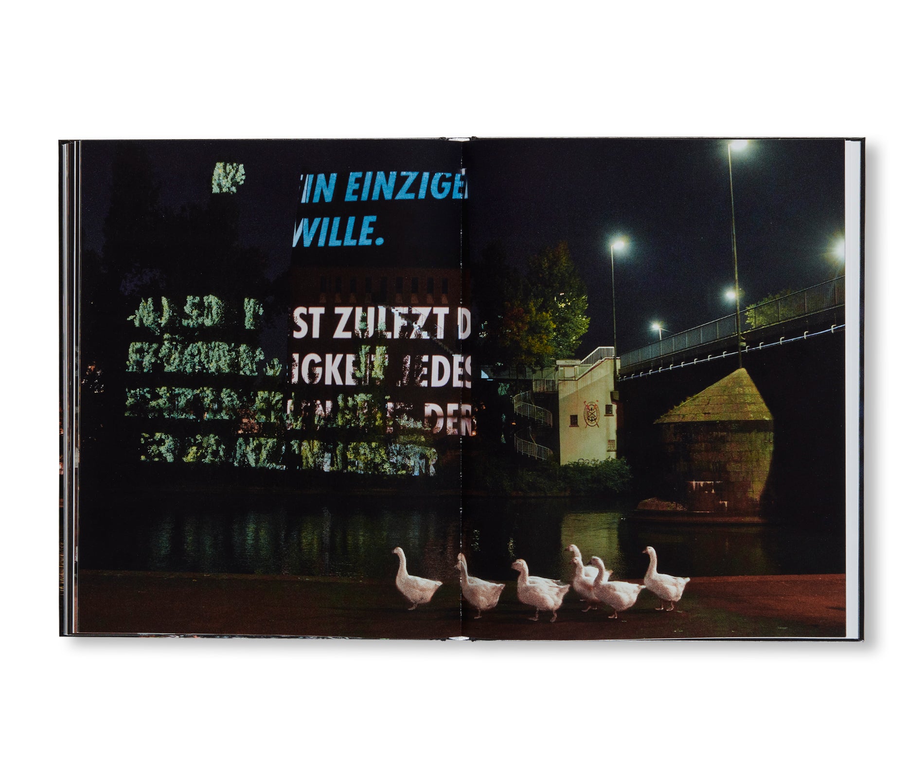 2010年10月4日夜、作者はフランクフルト市内でパブリック・アートを立ち上げ、ニコライ教会、レーマー広場、ドライケーニッヒ教会、文学館、カタリーネン教会、フランクフルト現代アート美術館という6つの公共施設の建物にスクロールするテキスト作品のプロジェクションを実施した。全てのテキストは都市そのものか、ドイツのプロテスタント宗派の歴史に関連するものであり、ヴィスワヴァ・シンボルスカ(Wisława Szymborska)、テオドール・W・アドルノ(Theodor W. Adorno)、ディートリヒ・ボンヘッファー(Dietrich Bonhoeffer)、マルティン・ブーバー(Martin Buber)、ヨハン・ヴォルフガング・フォン・ゲーテ(Johann Wolfgang von Goethe)、セーレン・オービュ・キェルケゴール(Søren Aabye Kierkegaard)、マルティン・ルター(Martin Luther)、フリードリヒ・ダニエル・エルンスト・シュライアマハー(Friedrich Daniel Ernst Schleiermacher)、パウル・ティリッヒ(Paul Tillich)といった哲学者や詩人、作家の作品から引用されたものであった。本書は、その作品を記録したものであり、作者にとっては異例の長文の抜粋が、重厚感あるサンセリフ体の大文字で収められ、ドイツの知的・文学的遺産をいかにドラマチックに表現したかを示している。