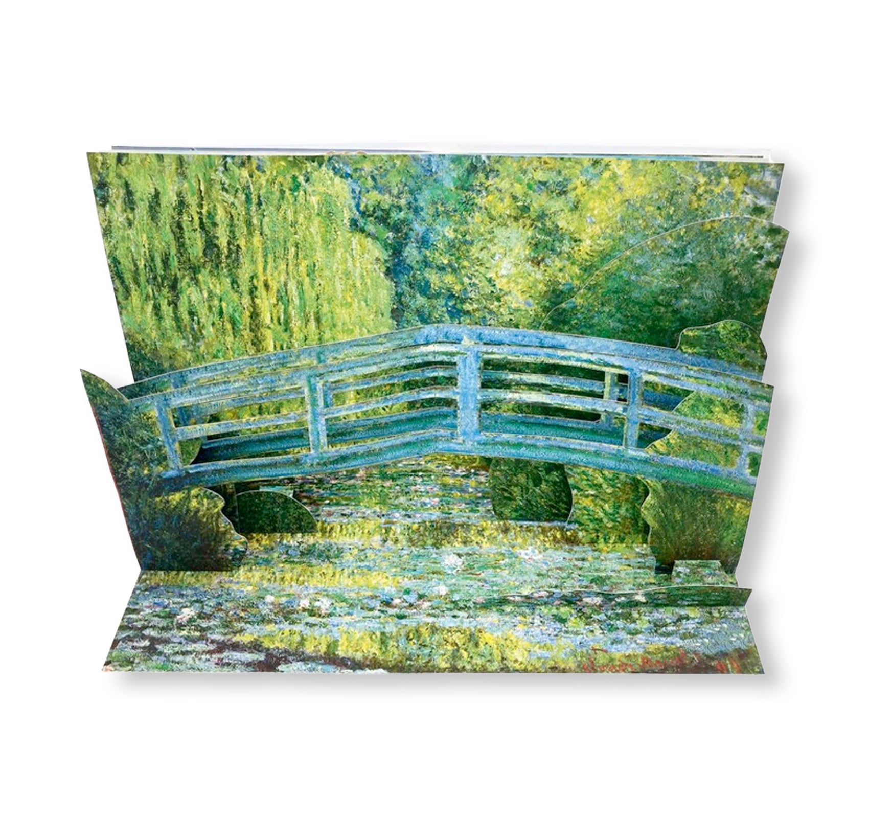 「サント・アドレスの庭園(Garden at Sainte-Adresse)」、「ケシ畑(Poppy Field)」、「睡蓮の池と日本の橋(Waterlilies and Japanese Bridge)」、「アルジャントゥイユ画家の家(The Artist’s House at Argenteuil)」、「アルジャントイユの橋(The Bridge at Argenteuil)」が用いられており、それぞれの絵画のページを開くと作品の簡単な解説とその歴史的背景が記されている。その説明部分を手前に引くと立体的なしかけが飛び出し、細かに描かれた花々、睡蓮、雲、木々、そして人物が生き生きと浮かび上がる。