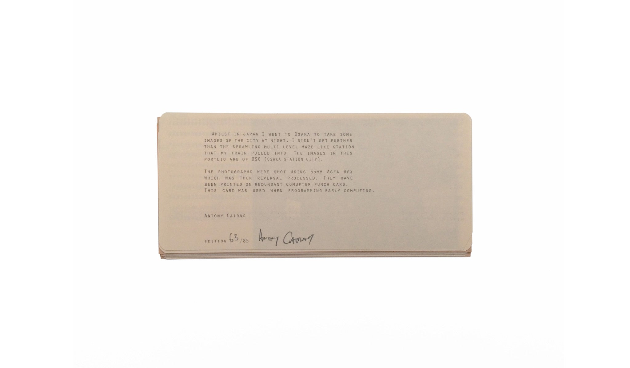 ロンドンを拠点とするイギリス人フォトグラファー、アントニー・ケアンズ(Antony Cairns)の自費出版作品集。来日時に訪れた大阪で、夜の大阪駅やその周辺を撮影した25つの作品を収録。これらの作品は、かつてコンピューターのプログラム用に使用されていたデッドストックや中古のパンチカードに印刷され、封筒に収められている。