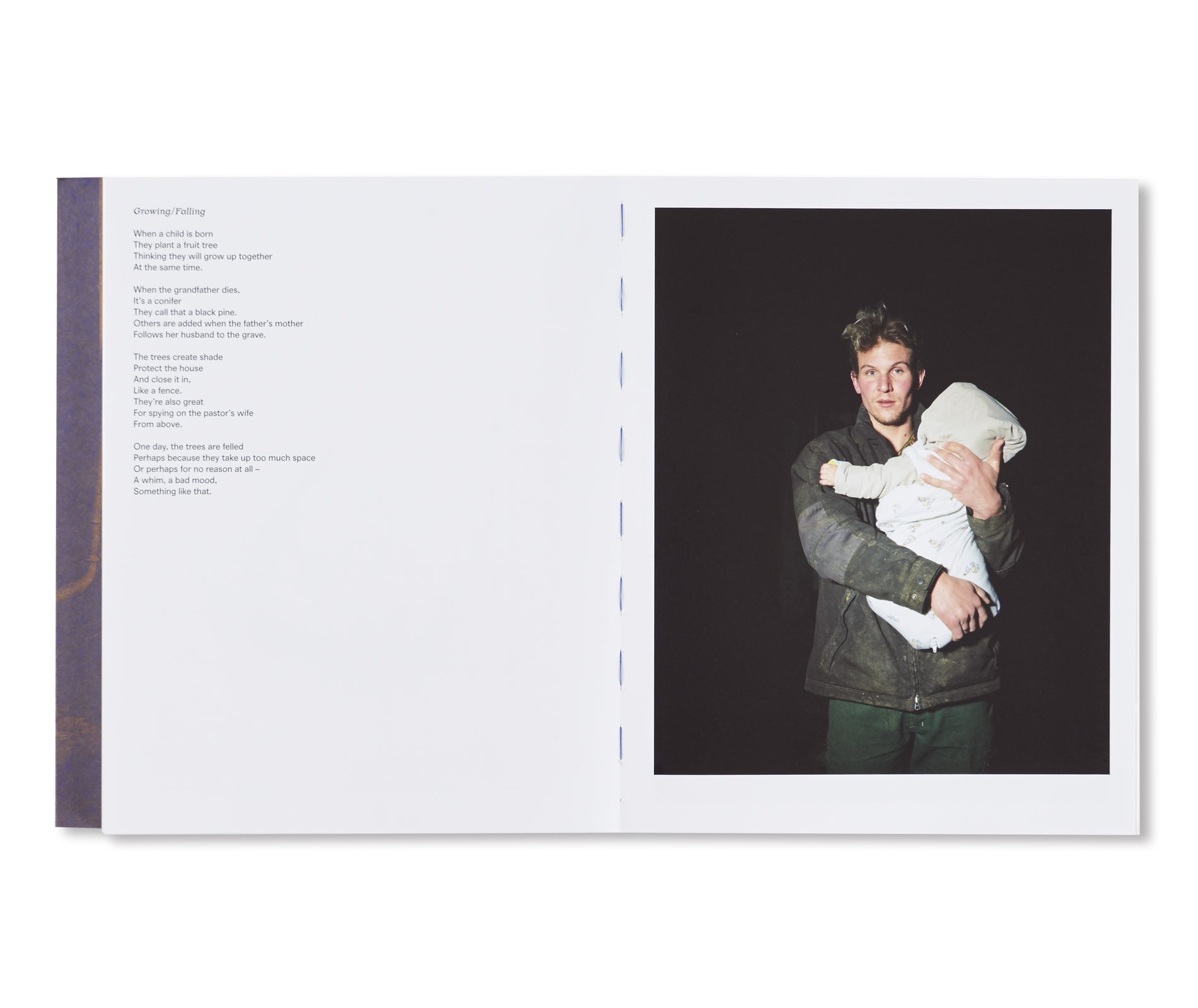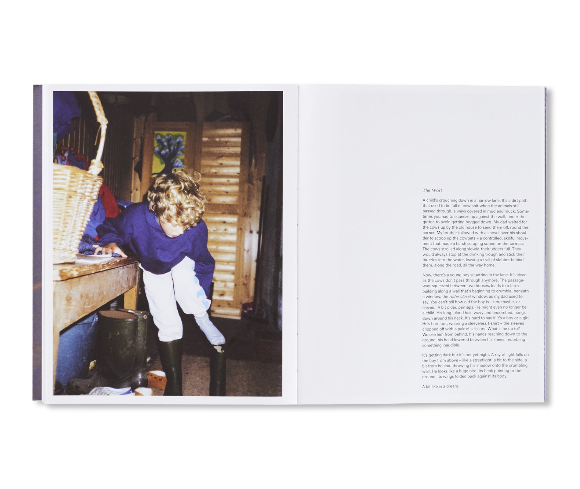 Part memoir, part tableau, Corbeau is a multi-layered narrative collage tracing life and death in the rural farm on which Swiss artist Anne Golaz grew up. Made over a twelve-year period and bridging three generations, the three-part book weaves together photographs, video stills and drawings, with texts by the author, screenwriter and playwright, Antoine Jaccoud, as well as the artist’s own writings. Jaccoud reconstructs transcripts of conversations between family members and memories recounted by the artist to build this intricate story of stories into a dramatalogical work. The protagonist of Corbeau is a young man seen in each chapter dutifully working on the farm. Gradually, however, his sense of duty appears to be instilled with doubt, a doubt that infuses the entire book. Exploring themes of time, life, destiny and death, Corbeau – which takes its title from an enigmatic poem by Edgar Allan Poe – eludes a chronological order to picture a place in which the future is only reminiscent of the past. And where destiny is shaped in the claire-obscures nooks of childhood. In the artist’s words, the narrative construction exists ‘in a vacuum’, which tellingly offers a framework for both support and destruction. It is within such a circumscribed space that mixed feelings towards heritage arise.