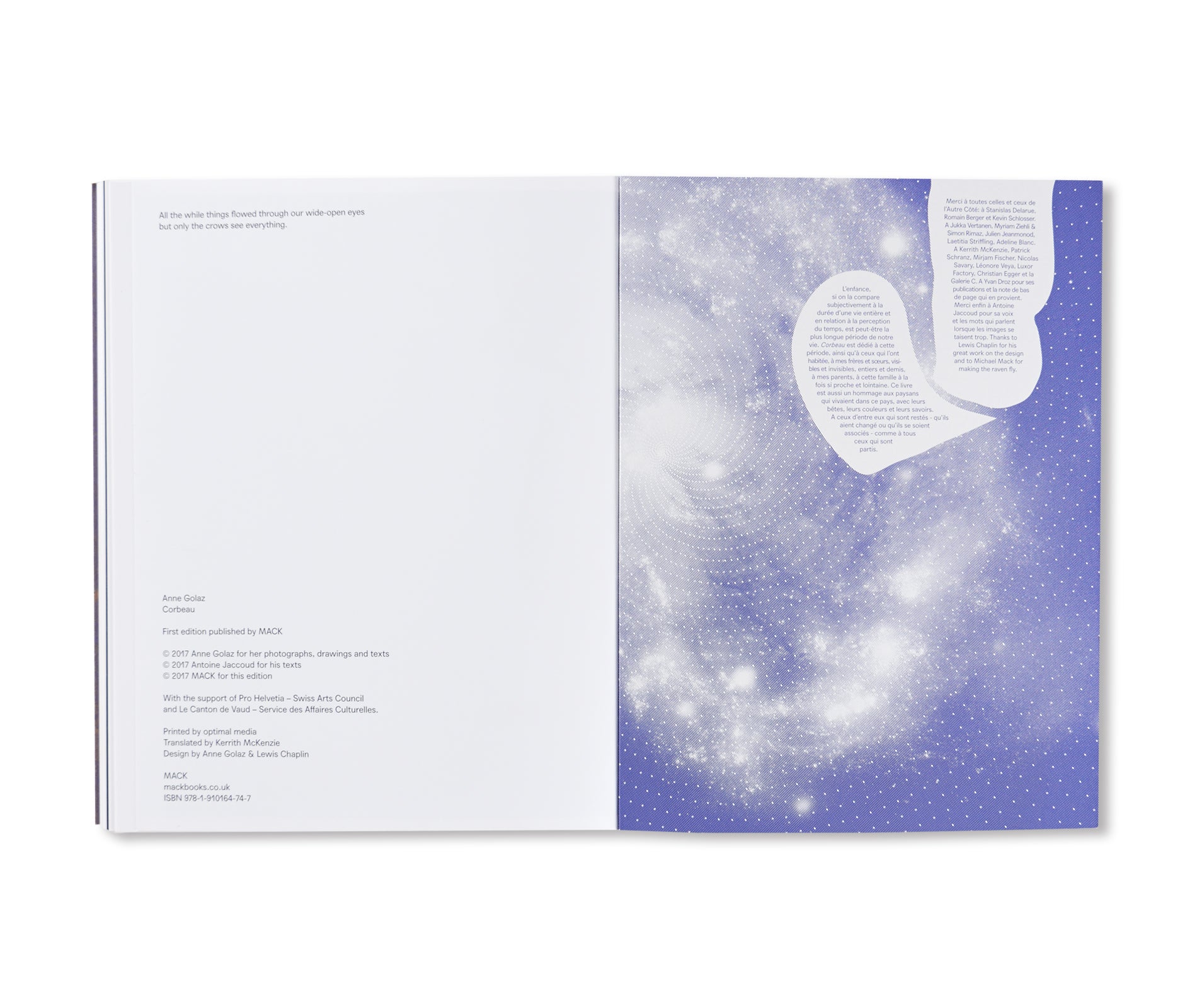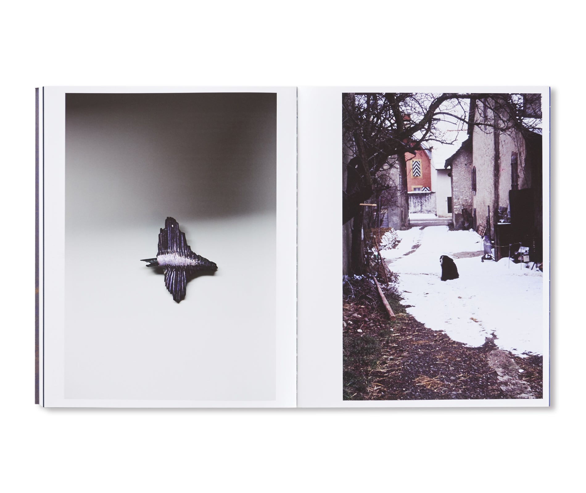 スイス人フォトグラファー、アンネ・ゴラズ(Anne Golaz)の作品集。回顧録のような、あるいは絵画のようなー そんな情景を、生まれ育った地であるスイスの片田舎の農場で触れた生と死を写し取り、多層的かつ詩的なコラージュとして仕上げた一作。12年間にわたり3世代を見つめ撮影したイメージや動画から切り取ったスチル写真、ドローイングが文章とともに編纂されている。文章は、作家であり脚本家、劇作家のアントワーヌ・ジャコ(Antoine Jaccoud)と作家自身により執筆。アントワーヌは、演劇的にコミュニケーションにまつわる行動を観察し分析、この入り組んだストーリーを形にするために家族間の会話や作者が順を追って語った思い出の数々を書き起こし再構築した。本作の主人公は1人の若い男性であり、各章において農場で律儀かつ堅実に働く姿を目にすることができる。しかし、次第に彼の義務感に疑念が植え付けられ、ある不安がシリーズ全体に満ちていく。タイトル「Corbeau」はフランス語でワタリガラスを表し、謎に満ち、生と死の間に立つ仲介人のような意味合いを持つ。エドガー・アラン・ポー(Edgar Allan Poe)が著した不可解な詩から引用したこの題名は、詩中において変わりゆくもののシンボルとして描かれるが、写真はその永久に過ぎ去っていく瞬間に縛られているようでもある。本作は時の経過、命、宿命、そして死をテーマとし、未来がただ過去を思い出させるだけの一存在であることを描くため時系列に沿った並びを避けた編集となっており、またどんな結末へも繋がらない。そして宿命は、明暗のコントラストがきいた幼少期の隅っこで形作られている。文中で作家は、物語的な創出は「掃除機の中に(in a vacuum)」存在していると記している。事実を述べると、その枠は協力と破壊どちらのためにもなりうる。そんな入り混じった複雑な感情が生じる囲われた空間なのだ。