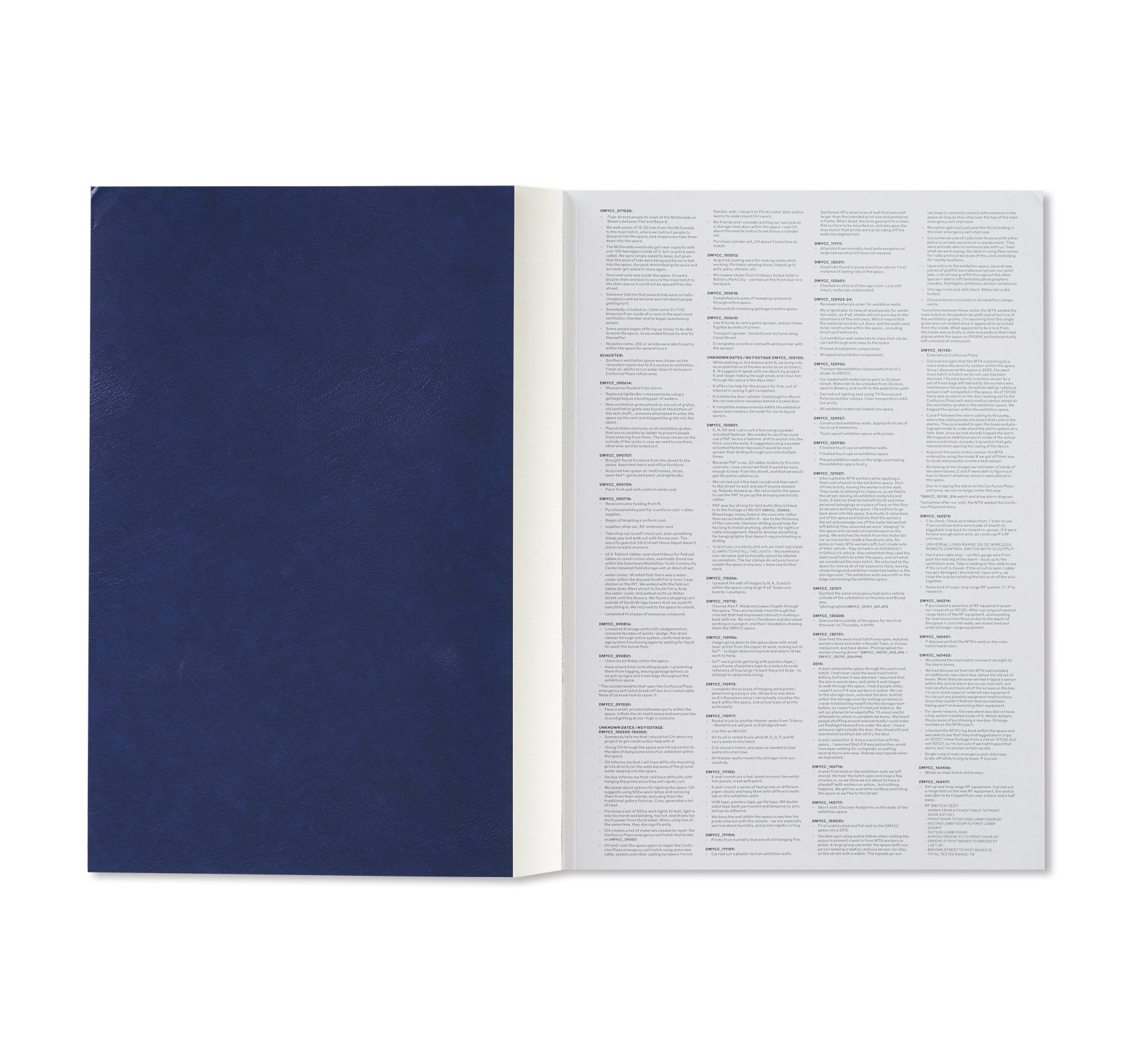 緩やかな時系列に沿ったストーリー形式で構成された本書は、結果的に広範囲に及ぶこのテリトリーのマッピングとなった。初期のあどけなさが残る探索の様子が写った刺激的な記録はアナログ写真やビデオスチール、レシート、設計図にまで及び、細部にまで触れながらも堅苦しさを残したアーカイブ的な構成を崩さず、公的文書のように収められた記録写真がレポートとして作品のコンセプトを着地させている。また、その場所の関係者や侵入者、そのやりとりや動きの図像化、移動手段の観察、ゴミやメモといったことを調査の対象とした。インデックス化することへの渇望やこだわりの強さは日に日に増していき、その様はまるでイメージの集積がその場所の所有者としての役割を証明するかのようである。このどうにも機能しなかった場所の粉塵を取り除き、排水路を使えるようにし、壁を塗り、配電線を修理し、照明を慎重に調整してリノベーションの質を保ち続けた。作者と友人たちは自治体の認可を得られる公式のものと、自由で非公式なものとの間の境界を壊したのだ。こういった活動を論理的な極地へと導き、物理的な境界や障壁を戦略的に取り除き、各々のタスクを科学捜査さながらにドキュメンタリー化した。その記録は、共感も批判をも生み、記録そのものが名もなき協力者としてその街を位置づけするだろう。