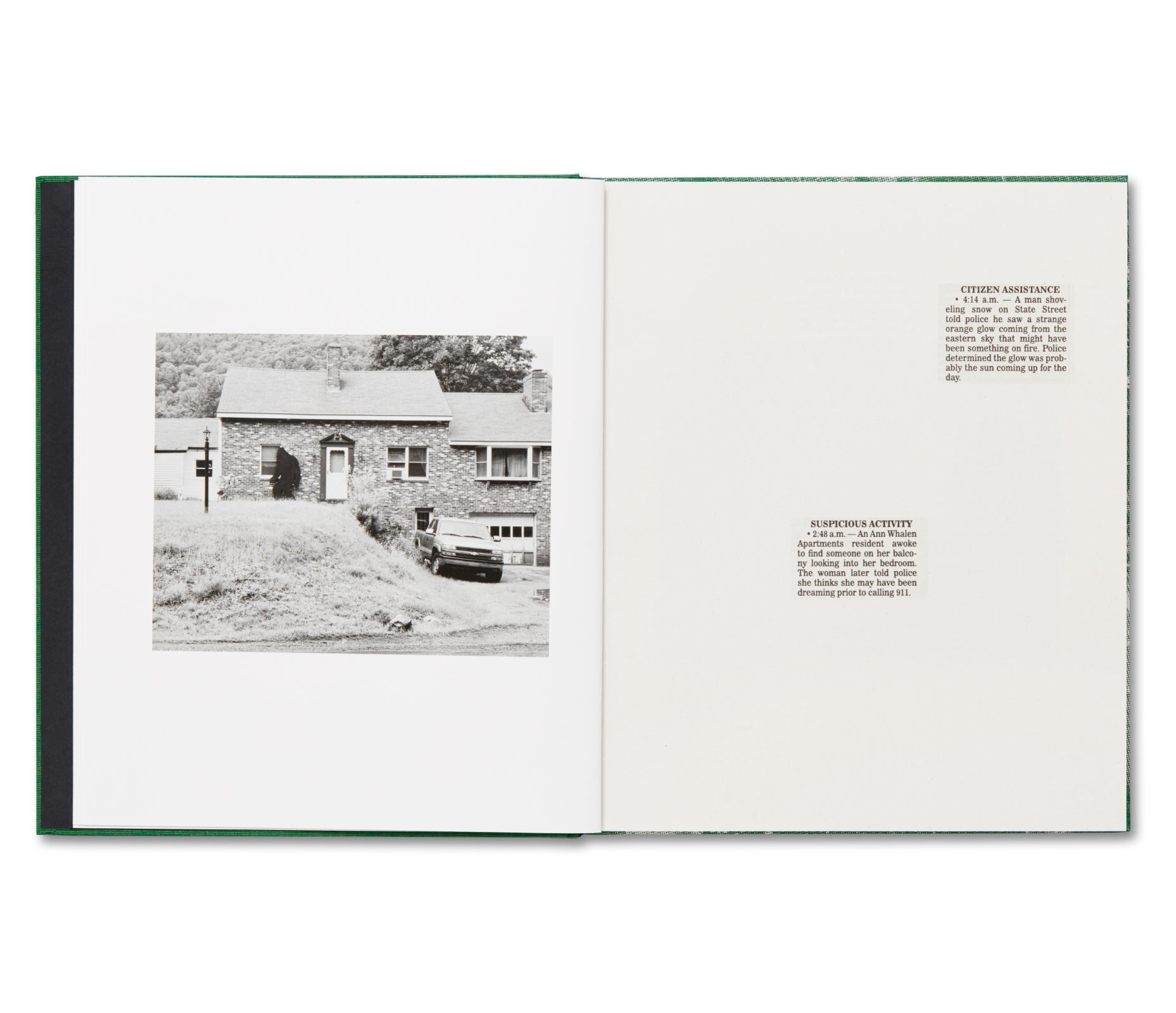 If you opened the local newspaper in the small New England town of Amherst, Massachusetts, as Aaron Schuman did one day, you might find a section entitled ‘Police Reports’ – succinct and extraordinarily anticlimactic accounts of crimes, suspicious activities, events and non-events reported in the area during the previous week. In SLANT, Schuman interweaves a selection of these clippings published between 2014-2018, with quietly wry photographs he made within a thirty-mile radius of Amherst from 2016-18, in response to their unintentionally deadpan descriptions. What began as a genuinely affectionate, tongue-in-cheek take on the small towns where Schuman spent his childhood steadily came to reflect the disquieting rise of “fake news”, “alternative facts”, “post-truth” politics and paranoia in America following the 2016 election. Schuman’s subtly offbeat combination of images and words, however, was always inclined to create a foreboding sense of unease. In SLANT, the relationship that has been constructed between photography and text takes its inspiration from a poetic scheme called ‘slant rhyme’, notably espoused by the 19th-century poet Emily Dickinson, who also happened to live and write in Amherst. In such a rhyming scheme, “there is a close but not exact correspondence of sounds, often using assonance or consonance; generally it is used in poetry to give variations and an inharmonious feeling.” Appropriating this literary device, SLANT serves as a wider reflection upon something strange, surreal, dissonant and increasingly sinister stirring beneath the surface of the contemporary American landscape, experience, and psyche.
