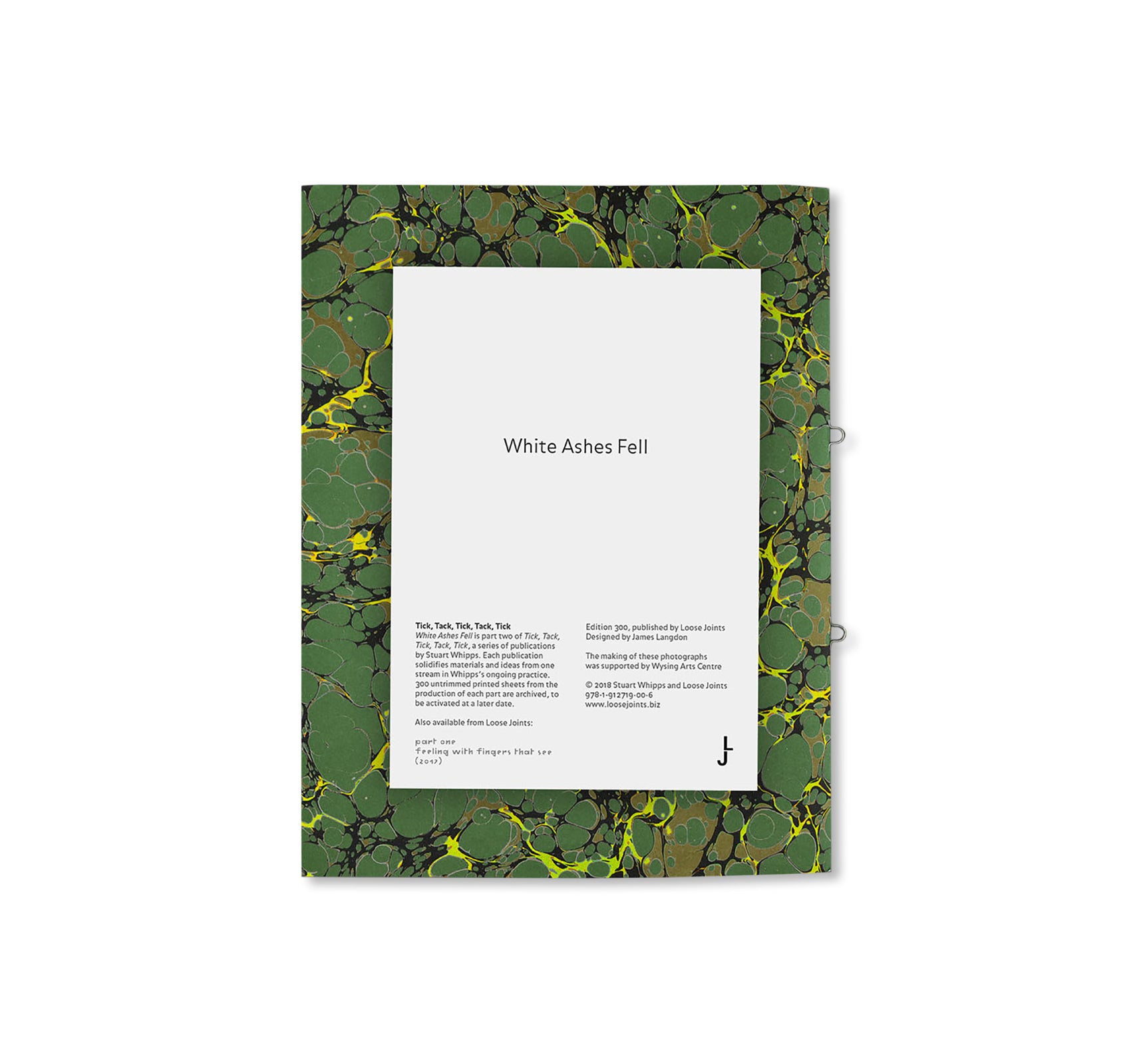 White Ashes Fell is part 2 of Tick, Tack, Tick, Tack, Tick, a series of publications with Stuart Whipps. Each publication behaves as an excerpt from Whipps' ongoing practice and the ideas circulating around it. Upon publication of each book, 300 untrimmed running sheets from the printing press are stored and archived, to be activated at a future date.