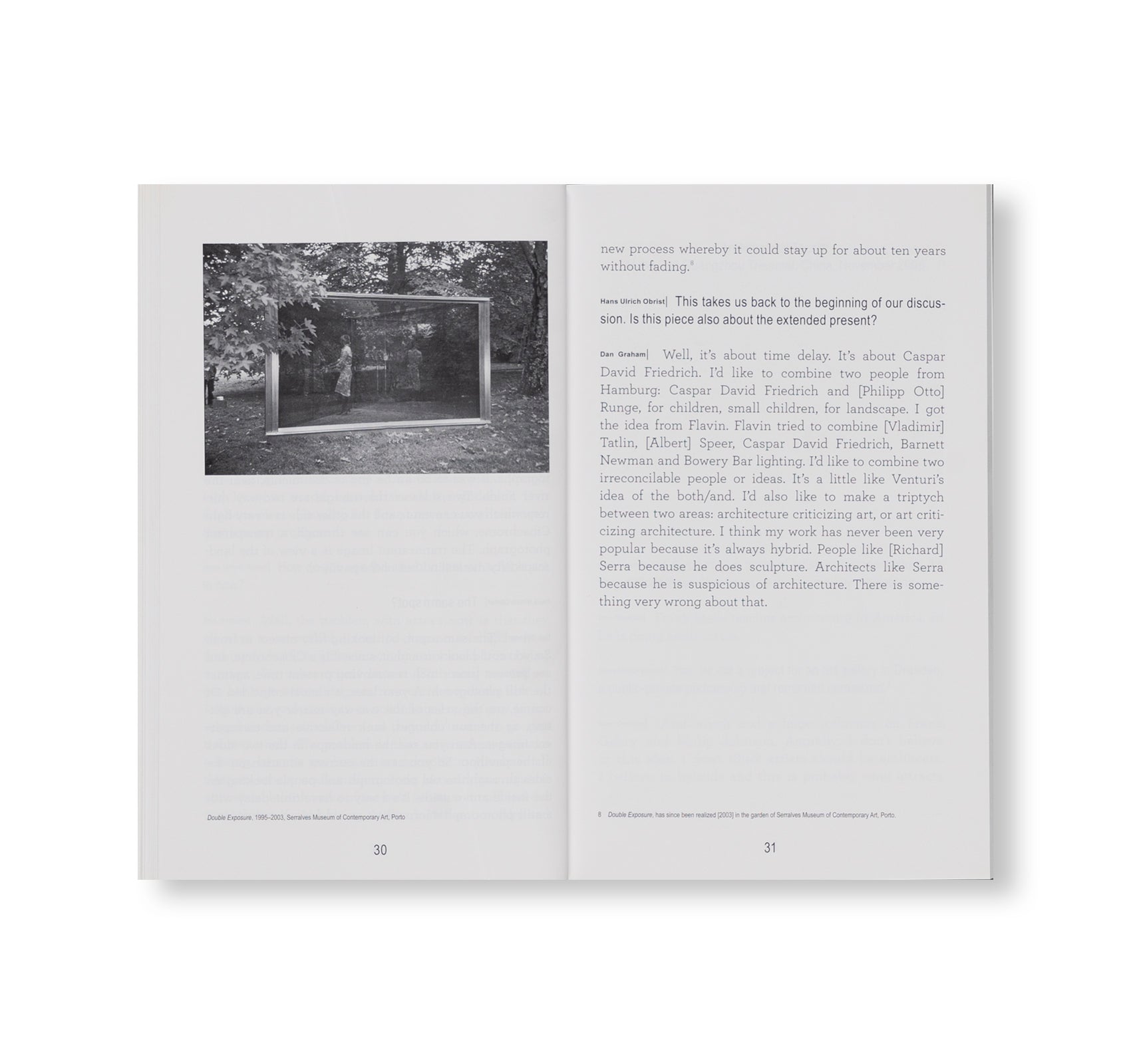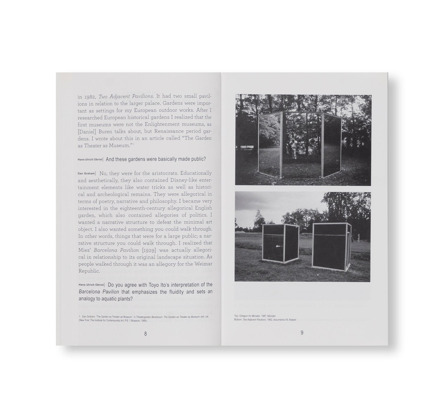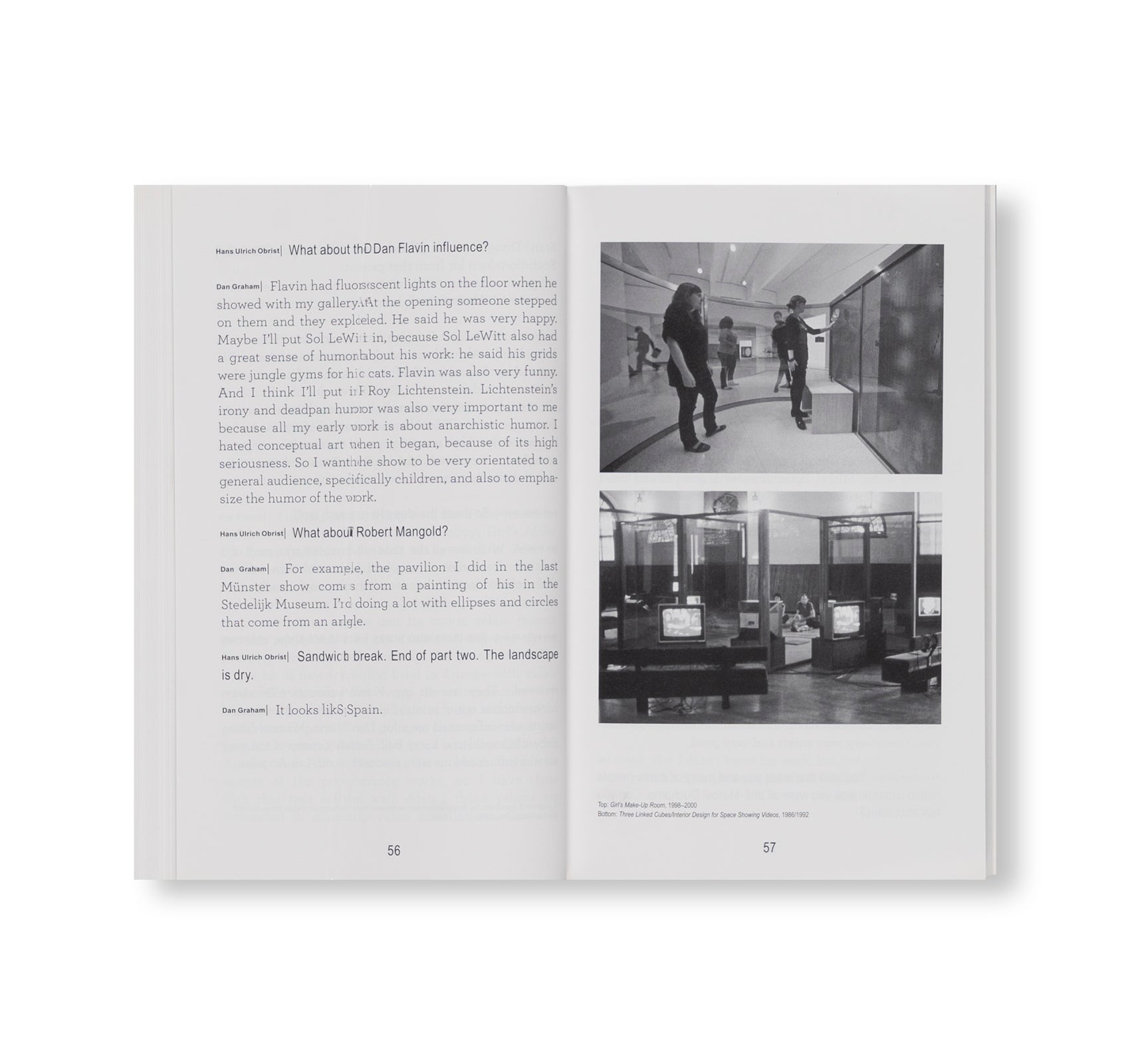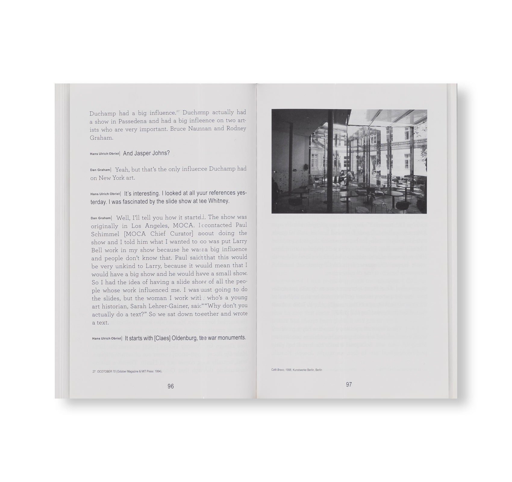 キュレーターであり、ロンドン「Serpentine Galleries」のアーティスティック・ディレクターを務めるハンス・ウルリッヒ・オブリスト(Hans Ulrich Obrist)とアメリカ人アーティスト、ダン・グレアム(Dan Graham)による対談をまとめた一冊。