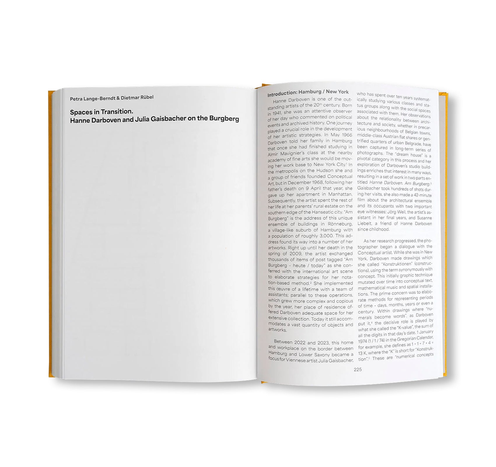 The publication concludes Julia Gaisbacher's long-time exploration of Hanne Darboven's Künstlerinnenhaus and at the same time continues her own work on "dream houses." The Viennese artist's photographs provide sensitive insights into Hanne Darboven's studios in the south of Hamburg in Germany. The five houses on the unique estate served as Darboven's living and working space for 40 years. To this day, the ensemble also functions as a treasury for thousands of objects and artworks. Gaisbacher's precisely composed black-and-white photographs of the rooms, whose seemingly chaotic abundance contrasts sharply with the strict order of Darboven's works on paper, create a compelling artistic dialog about time and space between the generations.