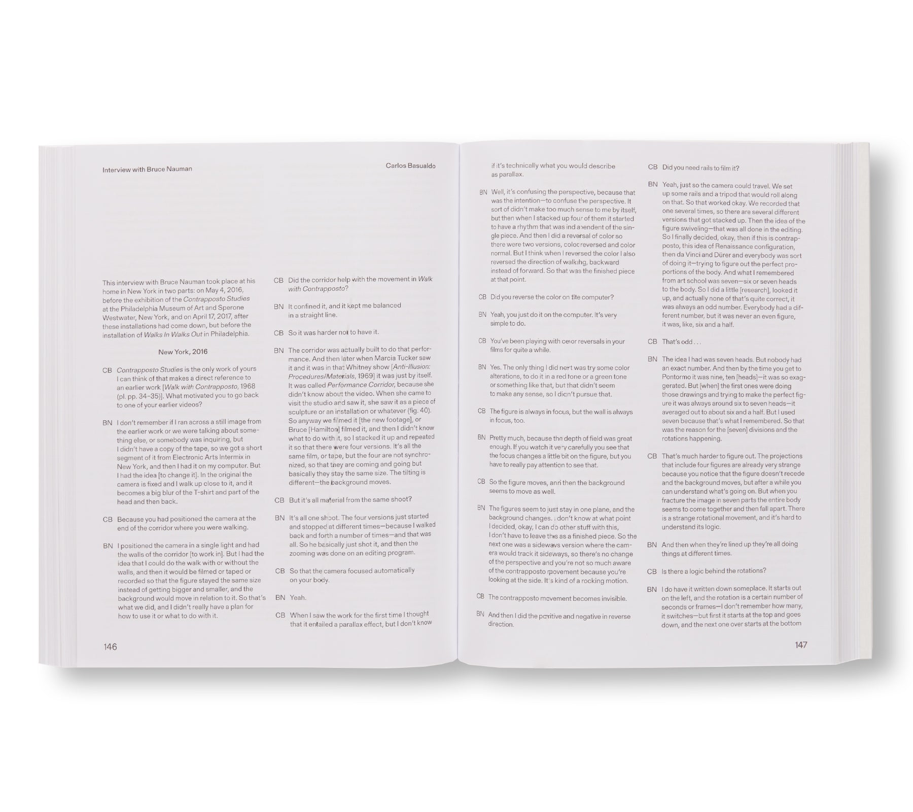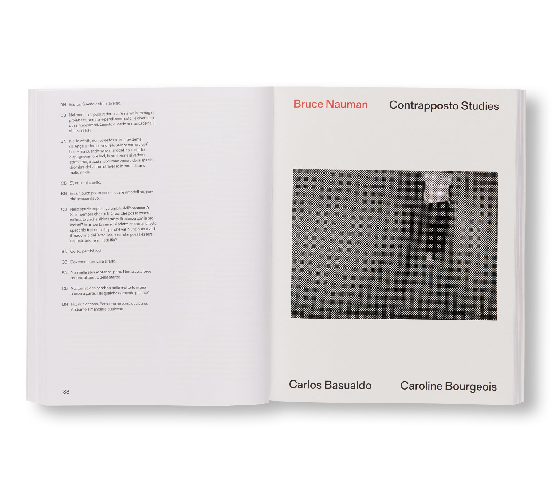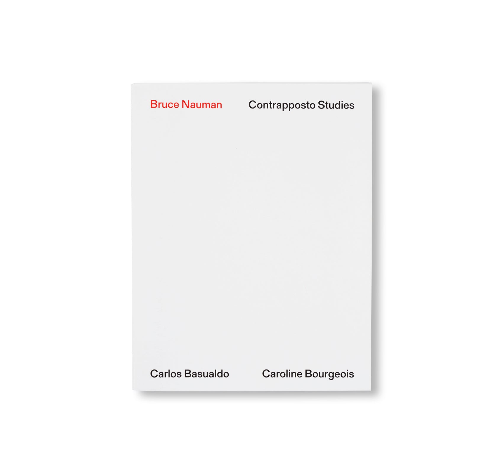 アメリカ人アーティスト、ブルース・ナウマン(Bruce Nauman)の作品集。2021年5月から2022年11月にヴェネツィアの現代美術館「プンタ・デラ・ドガーナ(Punta della Dogana)」で開催された展覧会に伴い刊行された。装丁はロンドンを拠点とするデザイン事務所「Zak Group」が手がける。この展覧会では、「フィラデルフィア美術館」と「ピノー・コレクション」の共同コレクションに所蔵する2つの作品「Contrapposto Studies, I through VII」、「Walks In Walks Out」が展示された。本展では、ウィットに富んだ作者が、1960年代に制作した「歩く」作品に新たなひねりを加えている。「コントラポスト」とは、重心の大半を片足にかけることによって上半身が体の軸からずれる人物のポーズを指す。最新作では、この古くからある芸術的概念を探求し、狭い廊下を歩きながら、古典的なポーズを取ろうとする1968年のビデオ作品「Walk with Contrapposto」を再訪する。作者は、現代のデジタル加工の技術を駆使して、この初期作品を新たな文脈で構築し、人間の動きや静止している表現に対して疑問を投げかけている。本書は、2015年から2019年にかけて制作された「Contrapposto」シリーズとオリジナルの映像の記録に加え、作者の活動を通じての空間とパフォーマンスの用い方を考察した新しいエッセイがスリップケース付きの2冊組書籍に収まっている。1巻は、エッセイ全7点と、「フィラデルフィア美術館(Philadelphia Museum of Art)」の「キースL.・アンド・キャサリン・サックス・コレクション(The Keith L. and Katherine Sachs Collection)」のキュレーターであるカルロス・バスアルド(Carlos Basualdo)と作者とのインタビューが収録されており、2巻は本展に出品された全32点の図版とエッセイが収録されている。