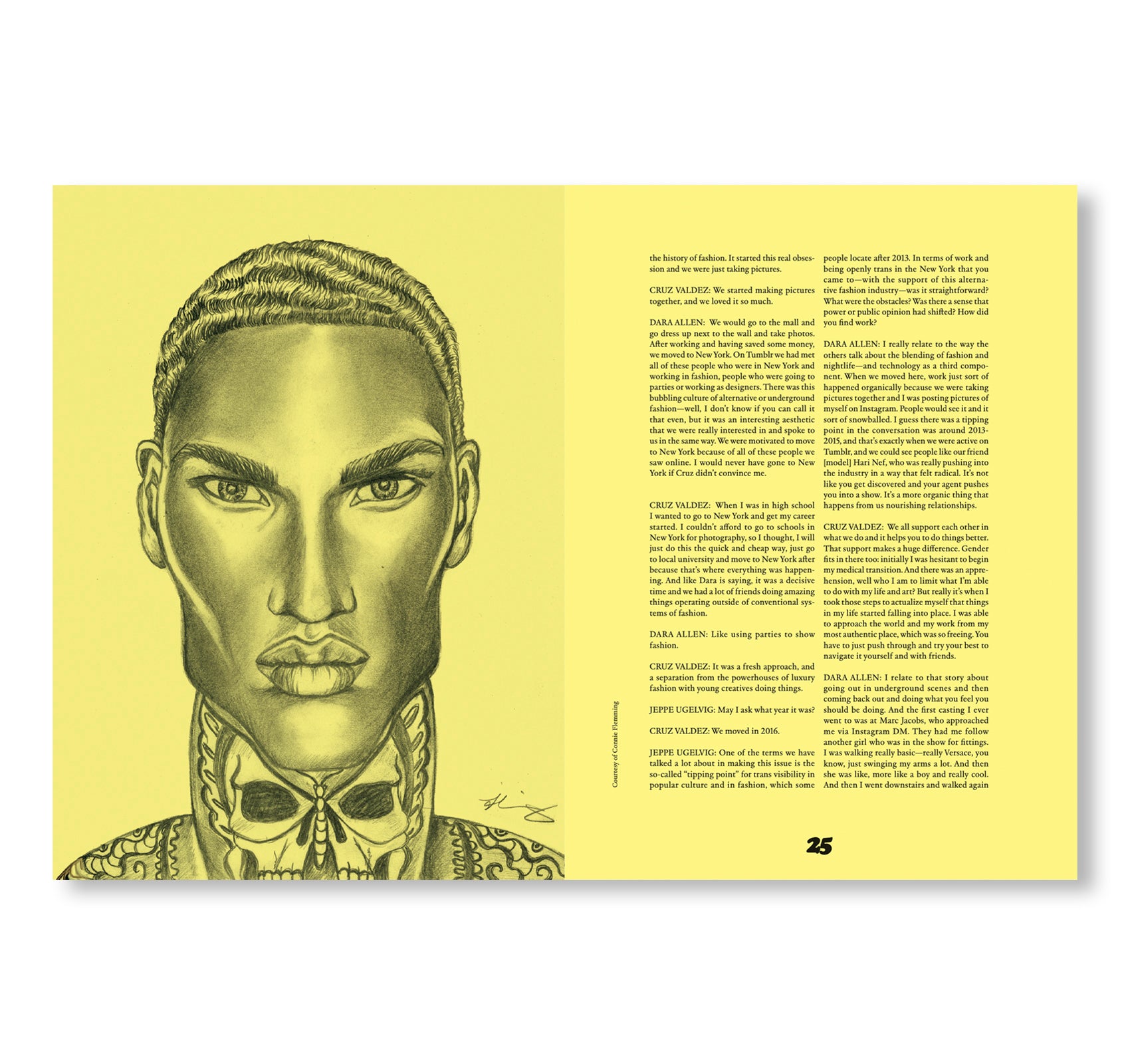 『Viscose』特別号となる第4号は、トランスジェンダーとファッションの間にあるさまざまな関係性を探求し、批評する。本書が問うのは相反する2つの質問である。一つは「トランスジェンダーにおけるファッション論とは何か」、そしてもう一つは「ファッションにおけるトランスジェンダー論とは何か」。ファッションビジネスの分野でその歴史と批評を研究し教鞭も取るアレックス・エスクラーピオ(Alex Esculapio)、クィア&トランス研究や美学理論、廃止論思想、ブラックネス研究を専門とするブラック・ノンバイナリー批評理論家であるチェ・ゴセット(Che Gossett)ら研究者を共同編集者として迎え、トランスジェンダーの美学と研究とともにファッション学に対し意義のある形で向き合い、ファッションそのものの裏側を形作ったトランスジェンダー史においてほとんど目に留められてなかった記録の発掘を試みる。世界中のトランスジェンダーないしクィアの作家、アーティスト、クリエイターによって書き下ろされたテキストを掲載し、未開拓な概念である「トランスジェンダーの文化的生産性」に対して可能性あふれるジャンルとして取り組んでいる。