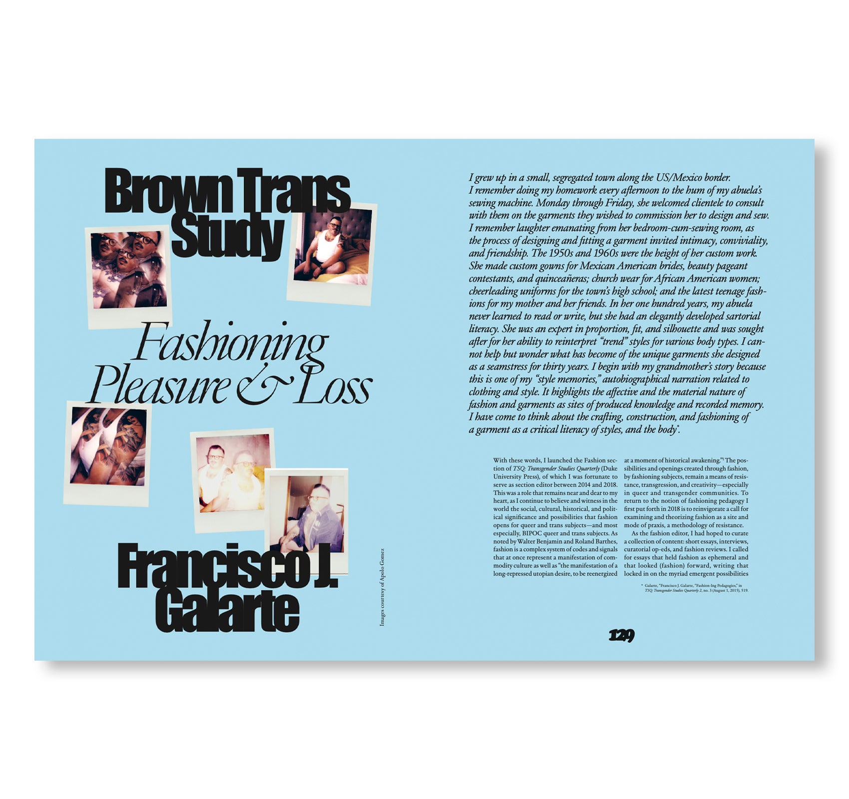 This special issue of Viscose critically explores the numerous relationships between transness and fashion. This issue sets out to ask two ambivalent questions: what is a fashion theory of transness, and what might a trans theory of fashion be? Co-edited with scholars Alex Esculapio and Che Gossett, Viscose 04 productively confronts fashion studies with trans aesthetics and trans studies, and attempts to excavate the largely invisible archives of trans history that form the underside of fashion itself. The issue features new contributions by a global cast of trans and queer writers, artists, and creatives, responding to the porous notion of “trans cultural production” as a genre full of potentiality. The issue features a wealth of archival and contemporary moments of trans fashion production spanning 50 years. The cover, designed by NYC-based designer and bookmaker Rissa Hochberger, celebrates histories of independent queer publishing, and doubles as a detachable poster. The inspiration of the issue was the ambitious retrospective of German artist Lorenza Böttner at the Leslie-Lohman Museum of Art in 2022. Böttner, a trans artist and performer who had both arms amputated as a child, celebrated the edges of gender and bodily expression through her multifaceted practice, often through idioms of costume and style.