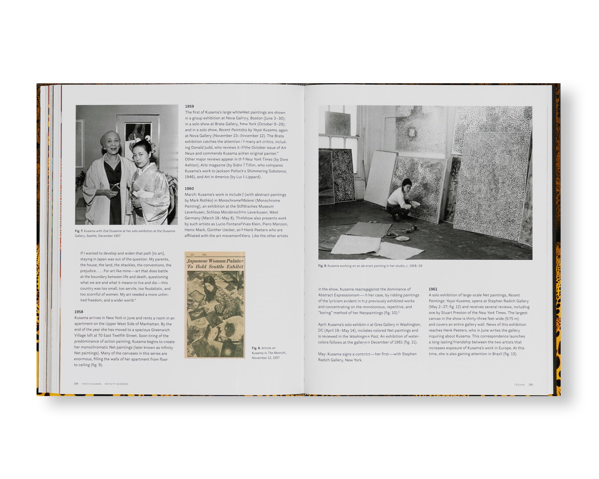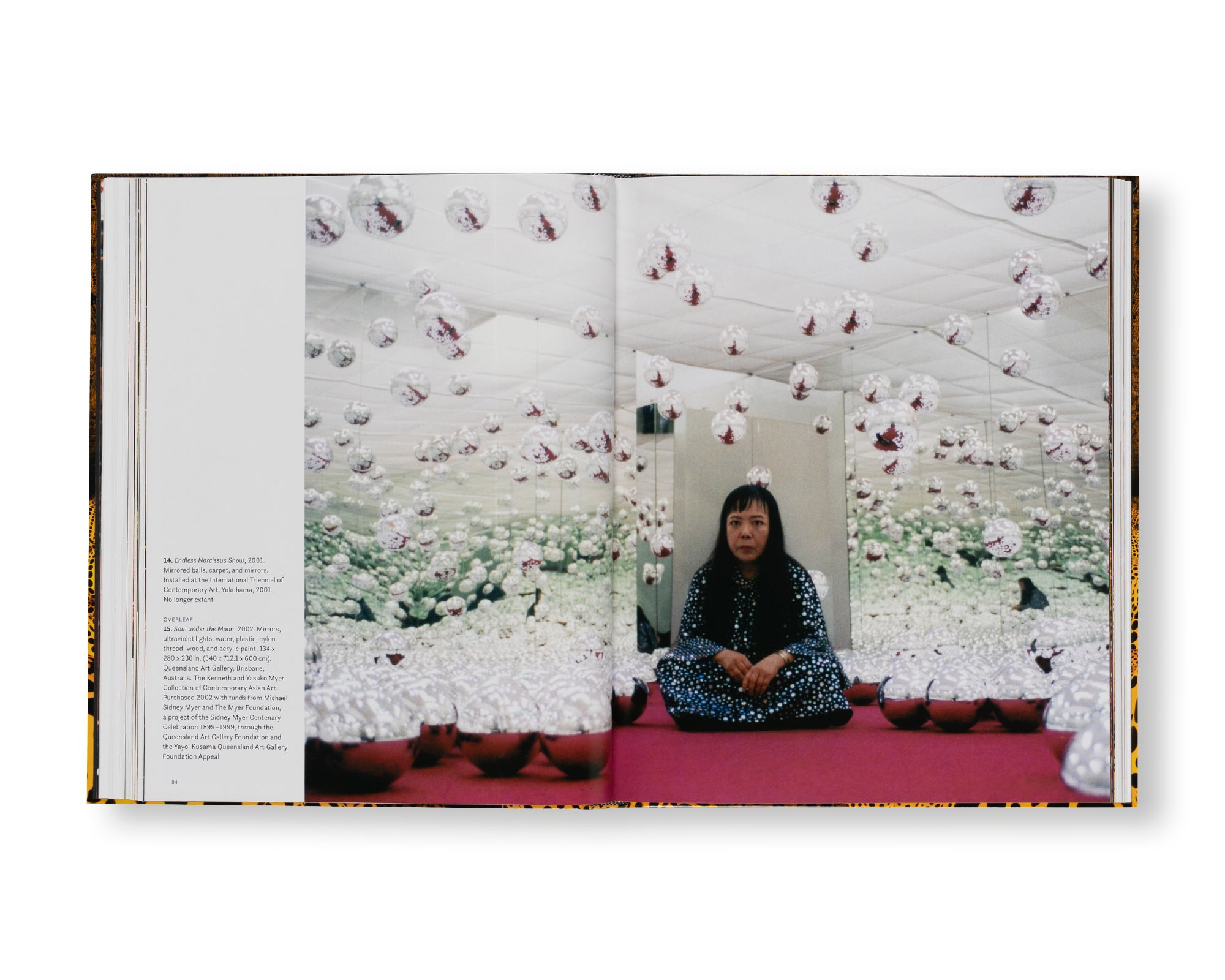 作者が制作した部屋は、無限に続く無数のカラーライトで満たされている。「のぞきからくり」のような一室やマルチメディア・インスタレーションなど、作者の万華鏡的な空間はどれも無限空間に一歩踏み入れてしまったような幻想を体験する機会が与えられる。この決定版的な一冊は、一連のインスタレーションを辿り、ベトナム戦争時期の「自己消滅(self-obliteration)」から現在のより調和的な野心まで、長い年月をかけ、作品がいかに様々な様式を象徴するようになったかを明らかにする。不安を想起させるような初期のインスタレーションを最近の作品の雰囲気とともに紐解くことで、現代における新しく実験的な創作に対する関心の中に見られる先進的な表現を歴史化している。豊富な作品群に彩られた本書は、『Infinity Mirrored Room』シリーズが作者のキャリアに及ぼした影響を我々に見せてくれる。