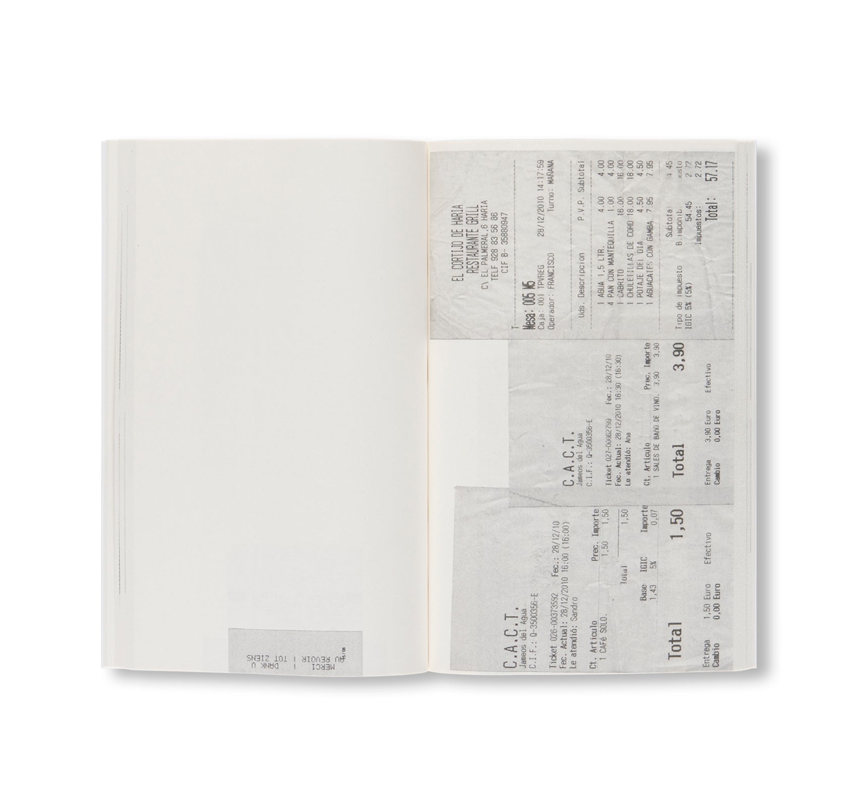 "Consummation Breakdown is a book with two front covers which THEREFORE offers two-directional reading. If read following one of the covers, this book shows the facsimile of a chronological arrangement: ordinary till receipts collected by the artist AND folded over the bottom of the right page, concealing the last bit of information WHICH IN TURN shows on the the left page overleaf. Flicking the pages backwards and upside down (following the other cover), one can read an index of phrases terminating each transaction, on the corresponding upright ends of each receipt." ーGabriel Kuri