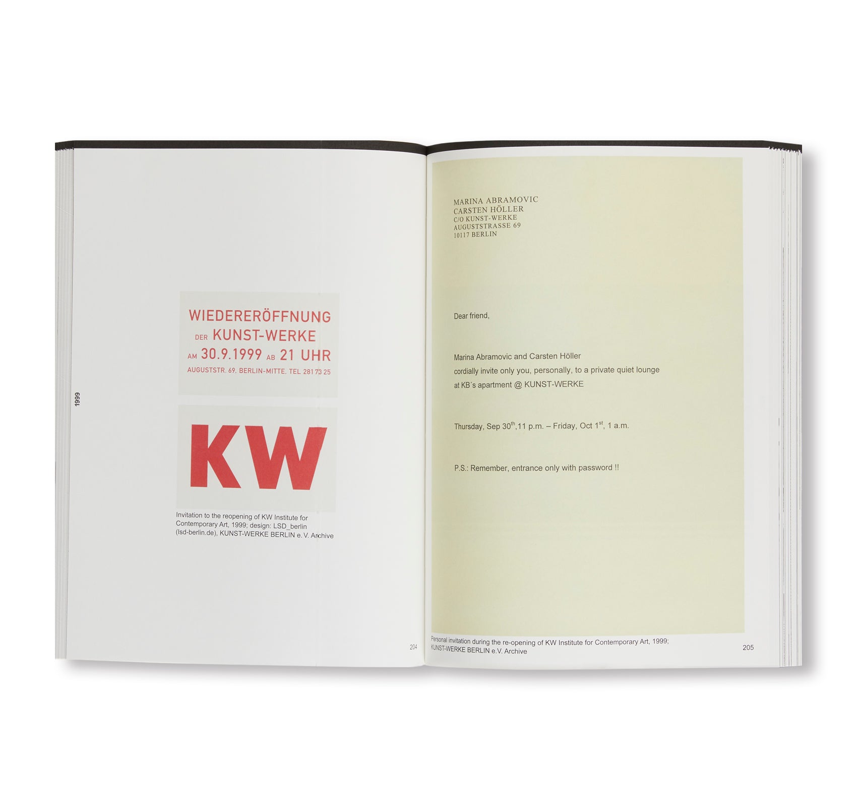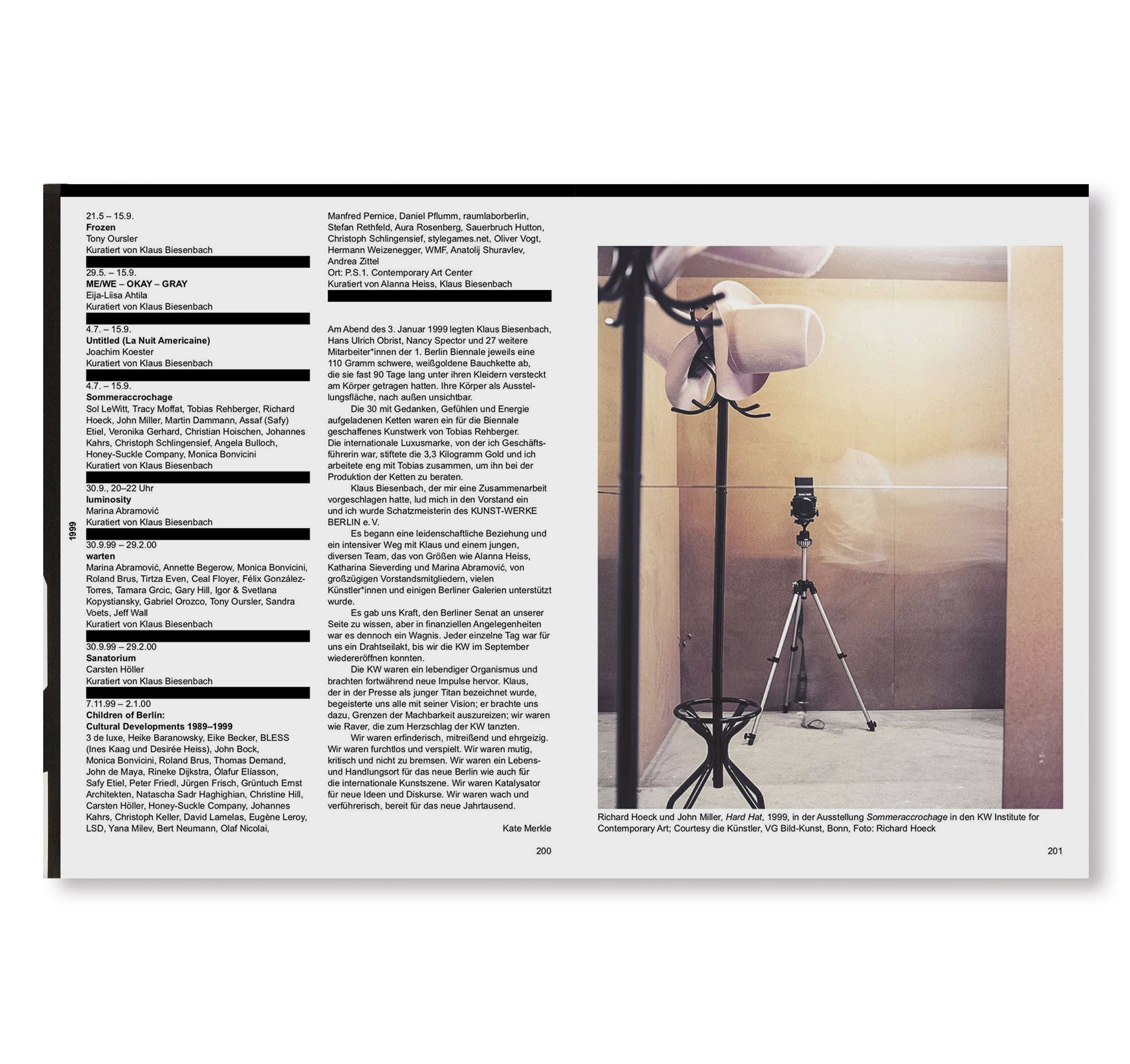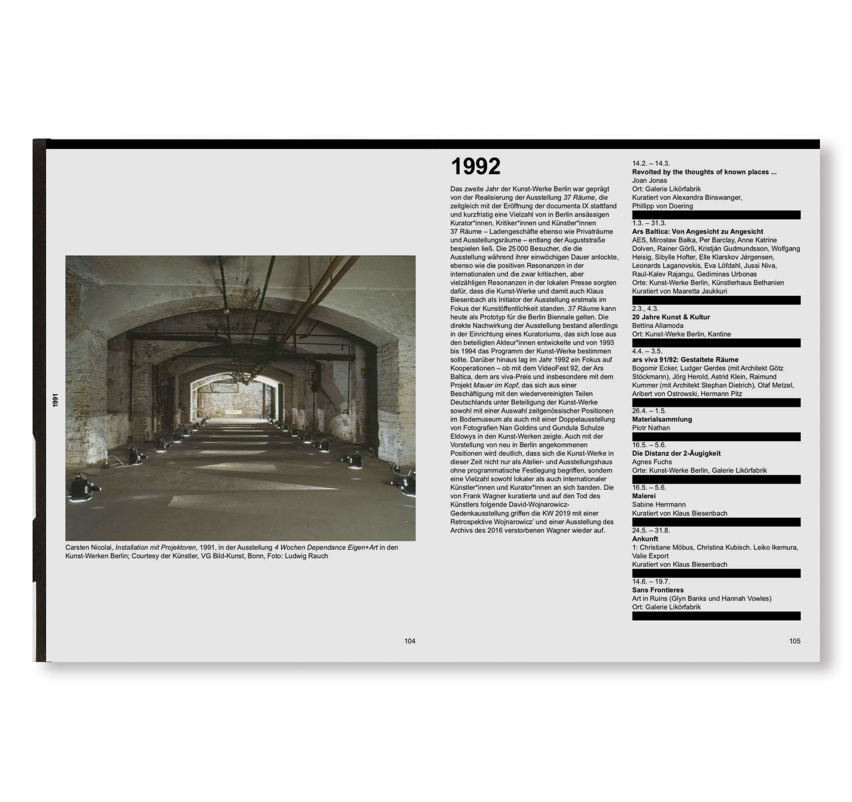 Released on occasion of the anniversary, this first comprehensive publication on KUNST-WERKE BERLIN e. V. is the fruit of Jenny Dirksen’s extensive research into the organization’s history. It presents selections from the sizable archive and unfurls a polyphonic institutional history, with a timeline running to over 300 pages, photographs, writings by Klaus Biesenbach, Jenny Dirksen, Susanne von Falkenhausen, Eva Scharrer, and Jan Verwoert, and recollections of contemporary observers and friends and associates of the KUNST-WERKE BERLIN from three decades.
