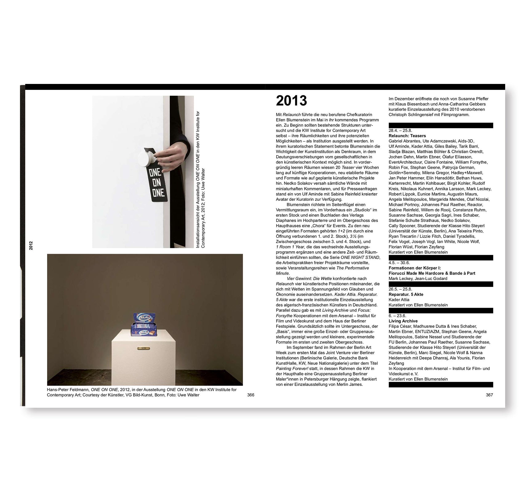 KUNST-WERKE BERLIN e. V., which operates the KW Institute for Contemporary Art and mounts the Berlin Biennale for contemporary Art, is one of the most highly renowned international organizations for contemporary art and celebrates its 30th anniversary in 2021. Founded by Klaus Biesenbach, Alexandra Binswanger, Philipp von Doering, Clemens Homburger, and Alfonso Rutigliano in 1991 and led by Krist Gruijthuijsen since 2016, the KW Institute for Contemporary Art has established what was originally a dilapidated margarine factory in post-fall-of-the-Wall Berlin as a site of progressive practices in the international art field. In addition to seminal exhibition projects like when tekkno turns to sound of poetry (1995), Stand der Dinge (State of Affairs) (2000), Territories (2003), Regarding Terror: The RAF Exhibition (2005), One on One (2012/13), Fire and Forget. On Violence (2015), and The Making of Husbands: Christina Ramberg in Dialogue (2019/20), KW has showcased the art of Absalon, Kader Attia, Keren Cytter, Cyprien Gaillard, Douglas Gordon, Channa Horwitz, Carsten Höller, Renata Lucas, Hiwa K, Annette Kelm, Mika Rottenberg, Anri Sala, Christoph Schlingensief, Hassan Sharif, and many others. First held in 1998 and directed by Gabriele Horn since 2002, the Berlin Biennale for Contemporary Art brings artists, theorists, and other prominent figures from all over the world to the city every two years and has made vital contributions to emerging discourses in contemporary art.